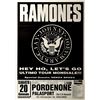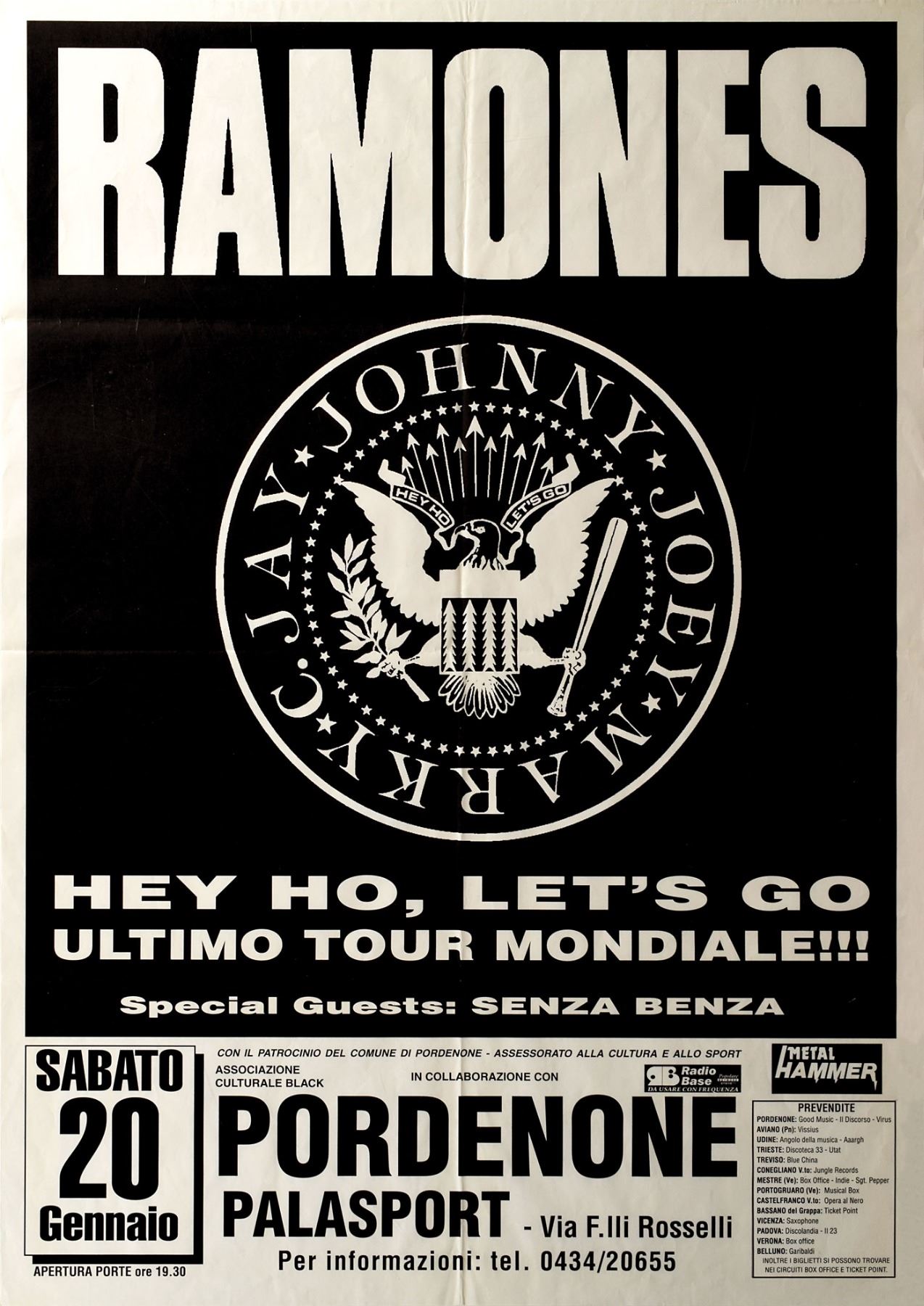 Black–and–white Acid Eaters Tour 27.5 x 39.25 poster for a Ramones concert at Palasport in Pordenone, Italy, on January 20, 1996, prominently featuring the band's presidential seal with bold white text below, "Hey Ho, Let's Go, Ultimo Tour Mondiale!!!" In fine, folded condition.