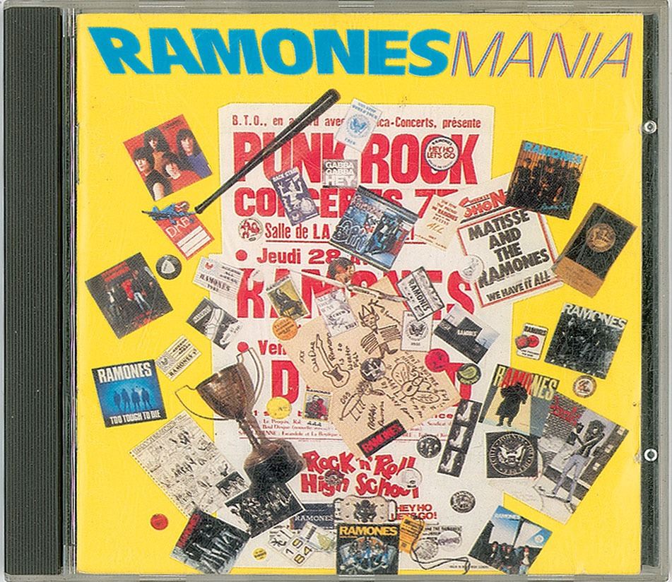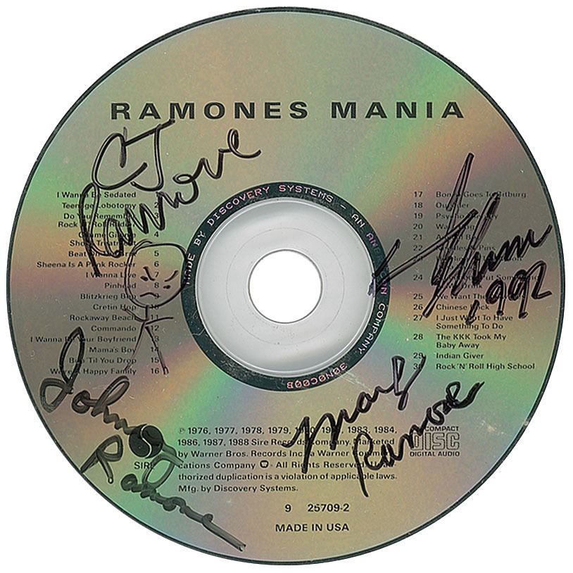 Ramones Mania CD by the Ramones, signed on the disc in black felt tip by Johnny, Marky, CJ, and Joey Ramone, with CJ adding a stick figure and Joey adding "1992." In fine condition.