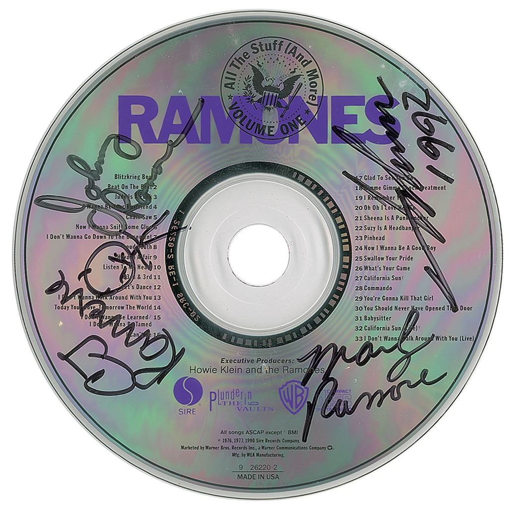 All the Stuff (and More)–Vol. I CD by the Ramones, signed on the disc in black felt tip by Johnny, CJ, Marky, and Joey Ramone, with CJ adding a stick figure and Joey adding "1992." In fine condition.