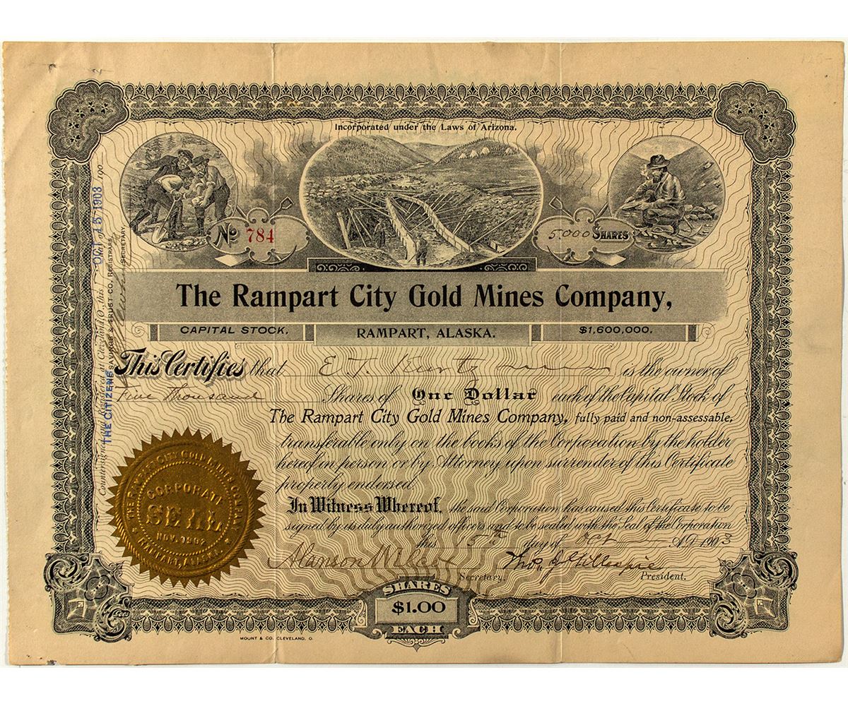 Cert. #784 issued to E.T. Kurtz in 1903 for 5000 shares of the Rampart City Gold Mines Company, Rampart, Alaska. Signed by Tho. J. Gillespie as president and Hanson Wilcox as secretary. Three mining vignettes with a sluice vignette in the center. The gold placer mines created a gold rush at Rampart in 1898. The city is located on the Yukon River in Central Alaska. Uncancelled.