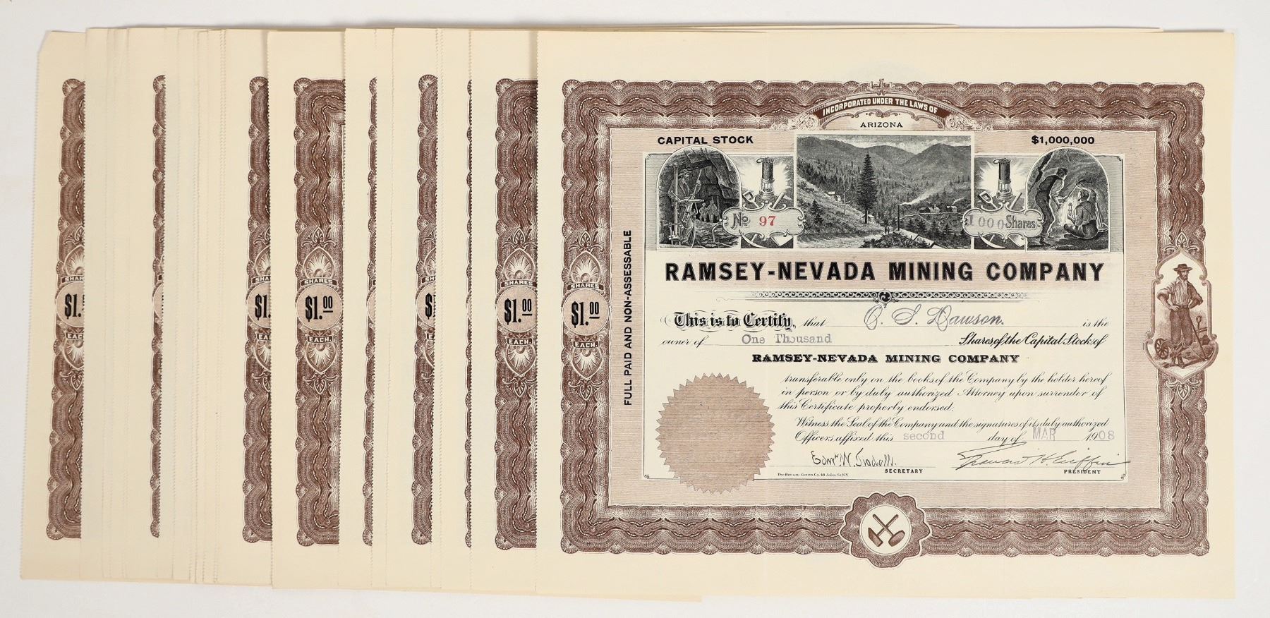 28 Ramsey-Nevada Mining Company c.1908. Issued. Incorporated in Arizona. Excellent mining vignettes. See photos.