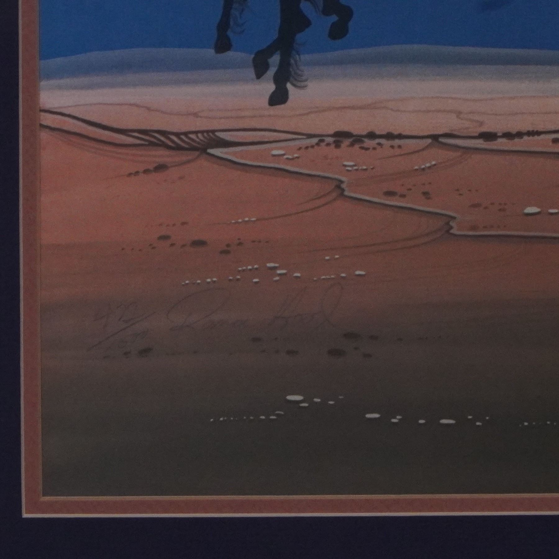 This limited edition print titled Coup Stick Song by renowned Native American artist Rance Hood showcases a striking depiction of a Native American warrior on horseback. Set against a dramatic deep blue background with silhouetted riders and a crescent moon, the piece embodies Hood's signature style, influenced by traditional Comanche themes and vibrant colors. The warrior's intricate attire, featuring a headdress, shield, and flowing feathers, highlights Hood's attention to cultural detail. Hand-signed and numbered 472/1500 in pencil by Rance Hood, this 1980 artwork also includes the artist's signature and copyright date within the composition. Rance Hood is a contemporary Native American artist, born in 1941 Oklahoma. He is of Comanche descent, and his work is deeply influenced by his Native American heritage, as well as the cultural traditions and spiritual beliefs of the Comanche people. Hood's artistic journey started at a young age, and he developed a passion for art that was deeply rooted in his Native American upbringing. Throughout his career, he has worked in a variety of mediums, including painting, sculpture, and mixed media, with his paintings often being the focal point of his artistic expression. His work is known for combining traditional Native American symbolism with contemporary styles, making it both visually striking and culturally significant. Professionally framed with a wooden border and double matting, it is ready for display. Artwork can be unframed and rolled for shipment.