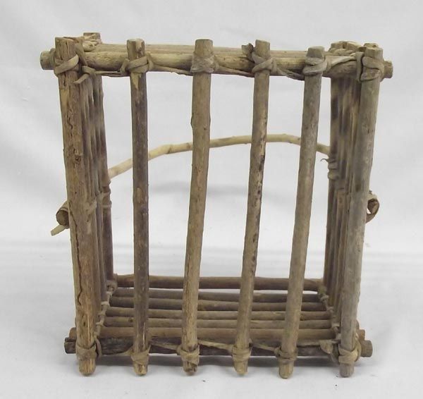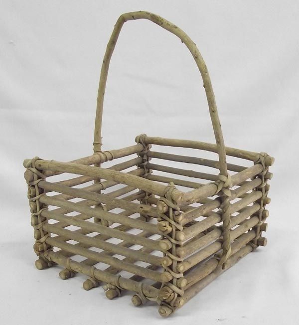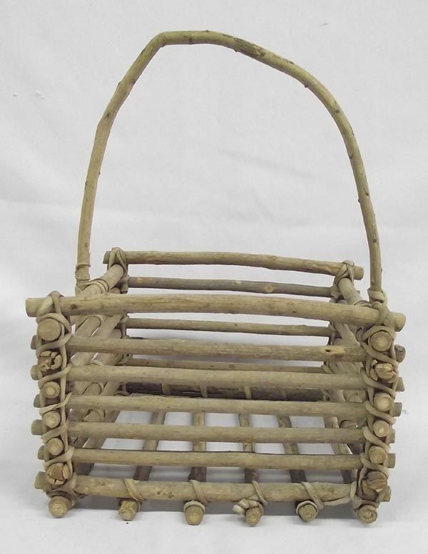 Ranchero Egg Basket. Well crafted hoop handled basket. Cottonwood branches tied together with rawhide. Measures 10 1/2'', 8'' x 7''. Functional as well as decorative.