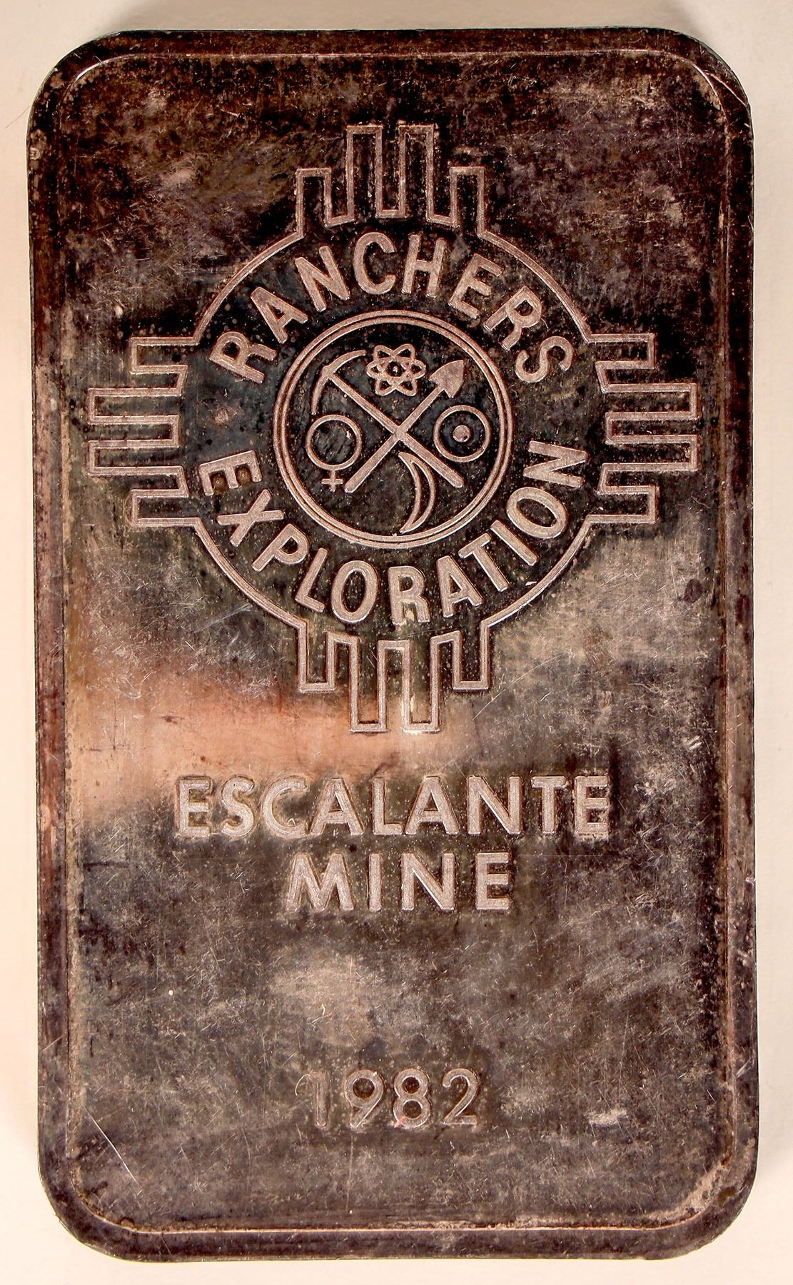 Johnson Matthey refined this five troy ounce silver ingot of .999 fine silver for Ranchers Exploration's Escalante Mine in 1982. The Dutch East India Company had regularly paid in-kind dividends to its shareholders in the 1600s and the Ranchers Development and Exploration Corp. of New Mexico in 1981 decided to follow in their footsteps. The June 1981 dividend was payable in gold, but in December, the company switched from gold to silver, and shareholders received a one-ounce bar of silver for every 120 shares that they owned. This would mean that the company paid out 25,000 ounces of silver to its shareholders. The March and June 1982 dividends were also payable in silver at the rate of 1 ounce of silver for each 120 shares. Investors who were tired of getting paid in dollars that were rapidly losing their value to inflation piled into the stock. Other corporations saw value in the company, and on July 27, 1984, Ranchers Exploration and Development Corp. was acquired by Hecla Mining. Hecla Mining did pay dividends to its shareholders, but in cash, not in gold or silver. [] [] [] [] []