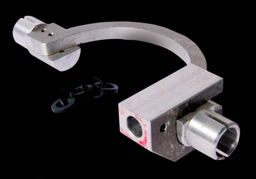 (TCF, 1983) This machined 7 ½ in. long handle was used as an animation rig on the Rancor puppet. The small chain link was machined out of plastic and made up the 4 in. long chain that is seen dangling from the Rancor’s right hand. From the collection of Chris Rand, machinist and model maker at ILM.