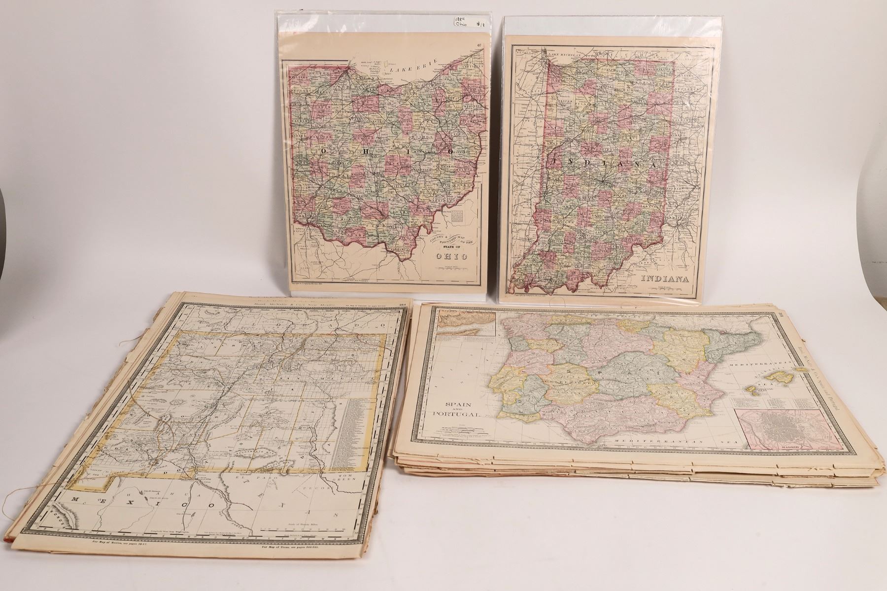 Miscellaneous vintage Rand, McNally & Co. maps of the United States and foreign countries. These loose maps were originally atlas pages but have been removed from their original binding. Some states that are included are Nebraska, California, Mihigan, Wisconsin, North Dakota, Iowa, Massachusetts, New Jersey, Indian, Colorado, etc. Foreign countries include Canada, Mexico, and parts of Europe and Asia. Many of these maps are printed in color. Pages are approx. 13.5 x 20.5 inches. Good condition, pages are somewhat frayed around the edges.