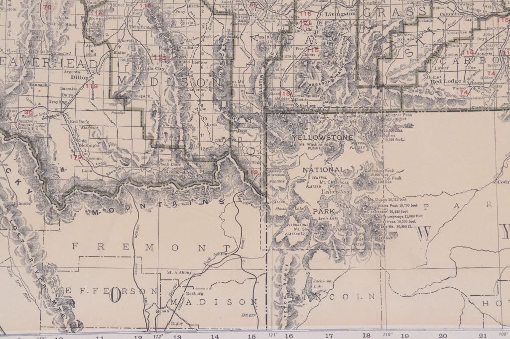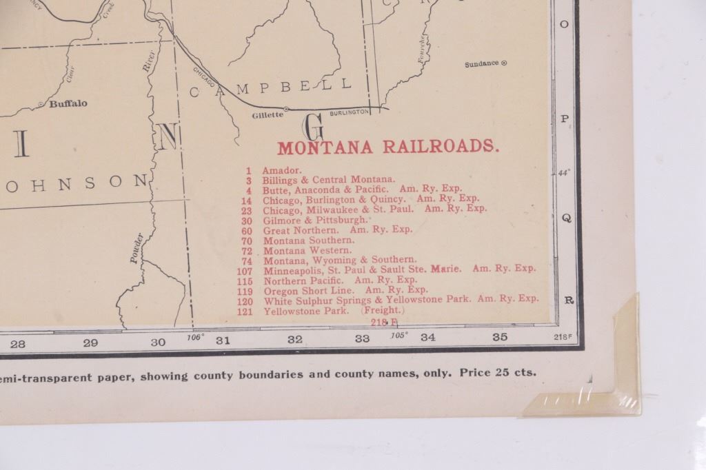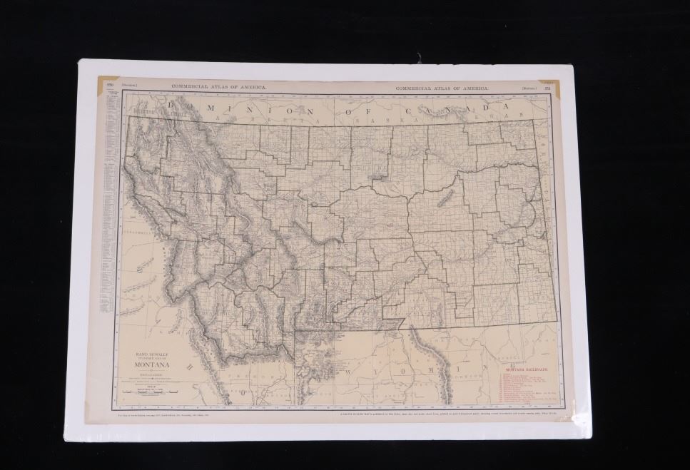 For your consideration is a Rand McNally Standard Map of Montana from the Rand McNally & Company, Chicago, circa 1920. The map shows Montana split by green county lines with railroads marked across the piece. The map features railroads such as; Amador, Billings & Central Montana, Butte, Anaconda & Pacific., Oregon Short Line, Montana Southern / Western/ Wyoming & Southern, Yellowstone Park (freight) and more. The map shows the entire state lines with British Colombia to the north, North Dakota to the east, Wyoming to the south, and Idaho to the west. The map shows detailed geography with numerous rivers and mountain ranges with elevations marked across the piece. Left of the map is a list of Principal Cities with populations and alpha-numeric locations on the map. This is a wonderful and impressive map that would make a great addition to any collection. The map shows good condition overall, and is protected with a foam board back and shrink, as well as corner protectors on the map. This piece measures approximately 20.5 x 28".