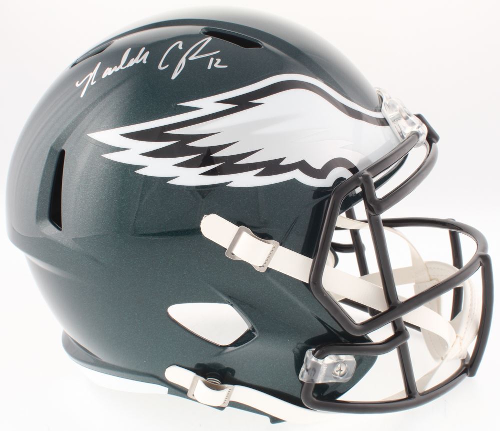 Philadelphia Eagles full-size replica speed helmet. Hand-signed in silver paint pen by Randall Cunningham.
