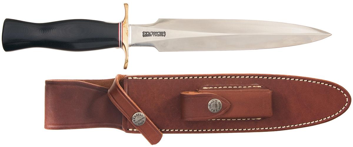 1) Randall dagger, 8 inch spear blade with scimitar flanked Orlando address marking, slightly turned down brass guard, micarta handle. OAL: 12 3/4". Complete with brown leather sheath with Randall address and the number "28" on the back. Included is a "Fine India" sharpening stone. 2) Early Chris Reeve Jereboam III Bowie knife circa 1988, 8 3/4 inch mate black blade marked "CR 145" on left ricasso, "MADE IN SOUTH AFRICA" on right ricasso, knurled handle. OAL: 13 3/4". Complete with black leather Chris Reeve sheath with nylon tie down strap. The included Spring 1988 Knives Illustrated magazine states that this bowie was donated by BlackJack Knives for the first Win this Knife contest and was won by Dwight Stanley of Raleigh, North Carolina (see page 6).