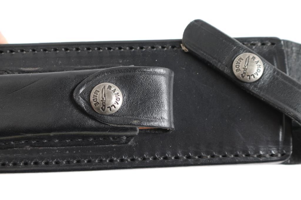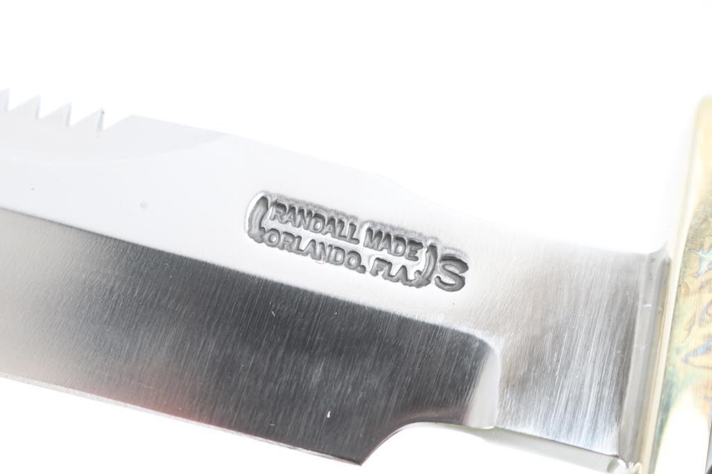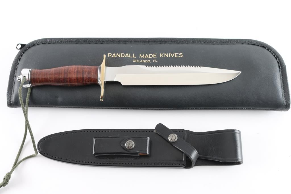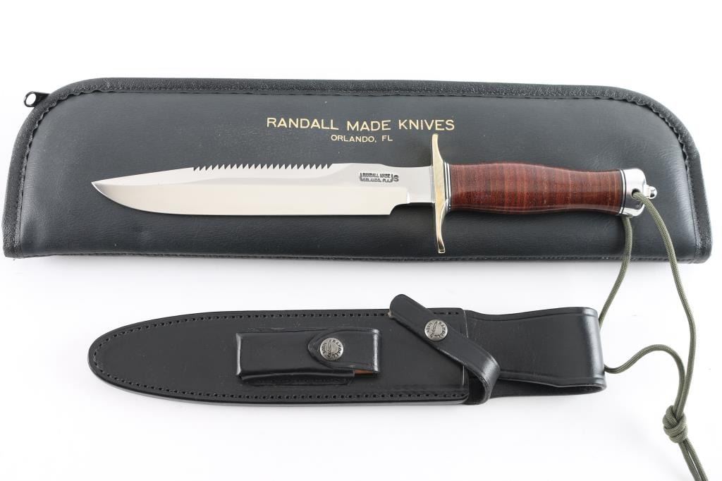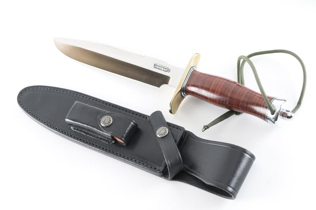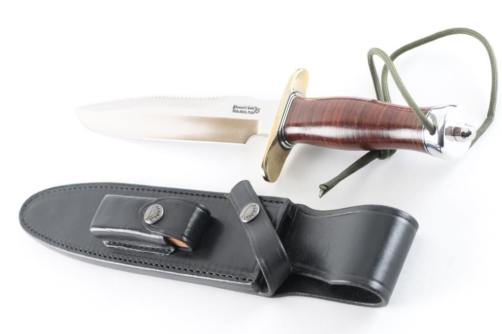 Model 1. 8" blade of 1/4" stainless steel stock. The top cutting edge is sharpened approximately 2 1/2" w/ approx. 3" of saw tooth (not off-set). Brass double hilt. Approximately 4 5/8 - 5" commando style leather handle. Nickel butt cap and bolt. Wrist thong through nickel ferrule in the handle. Comes with black leather sheath w/ sharpening stone.
