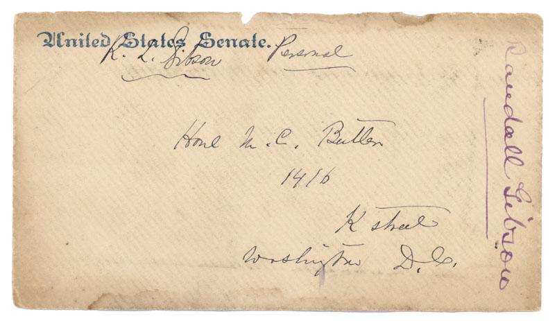 RANDALL L. GIBSON (1832-1892) U.S. Senator and Representative from Louisiana. Gibson also served as a brigadier general in the Confederate States Army, a regent of the Smithsonian Institution and as president of the board of administrators of Tulane University. United States Senate envelope Free Franked, "R.L. Gibson." Very Fine.
