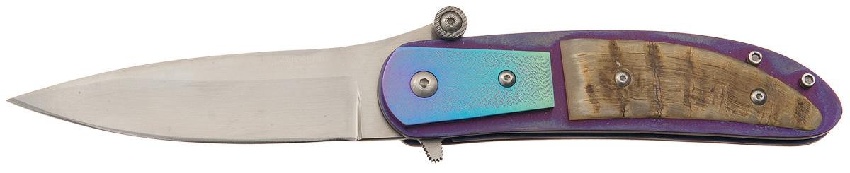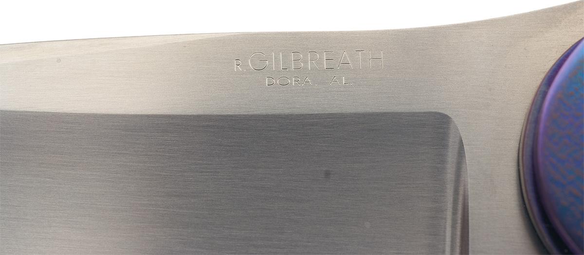 This custom folding knife was handcrafted by Randall Gilbreath. The knife has a 3 1/2 inch blade marked "R. GILBREATH / DORA, AL". Metallic alloy frame and bolster with Horn scales that are shorter than the frame and secured with two rivets. OAL: 7 3/4"