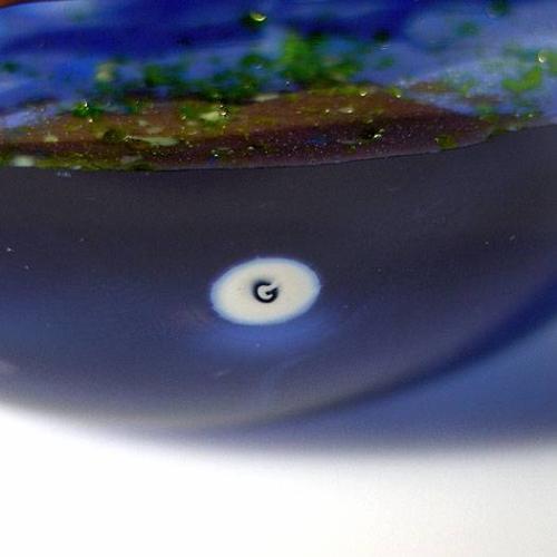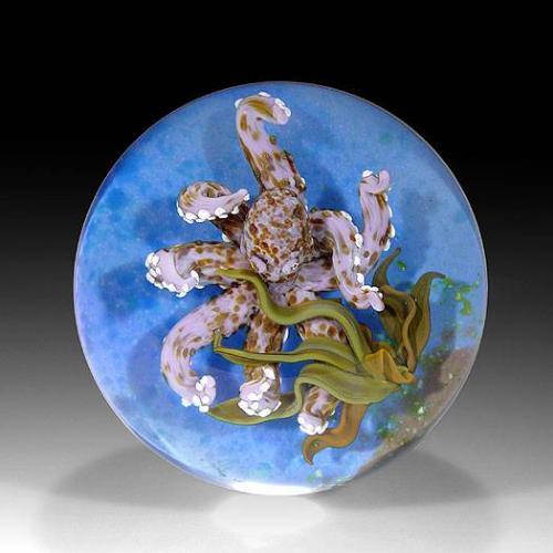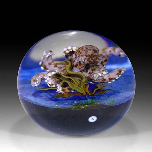 Randall Grubb "Octopus" paperweight with a pale lavender octopus, having brown markings, trying to hide behind blades of green sea grass, on blue ground. "G" signature cane. Diameter 3 1/8".