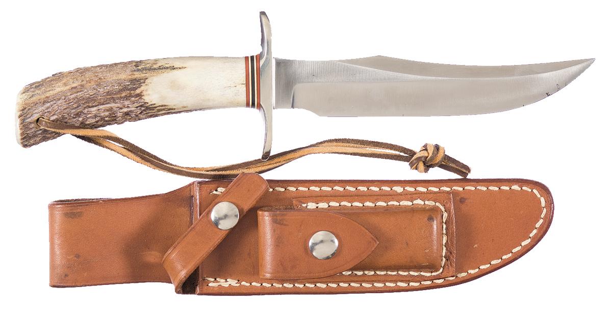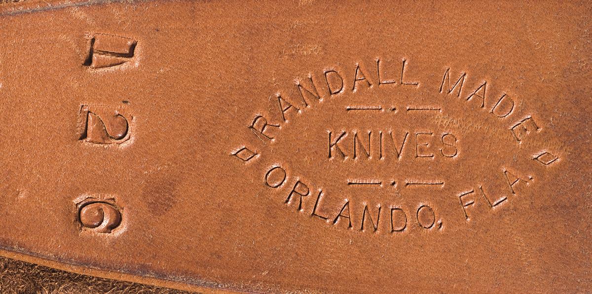 6 inch long carbon steel blade with 4" sharpened back clip. The blade has the standard two line Randall marking, with dual quillion nickel steel cross guard and one piece stag grip. OAL: 10 3/4". Complete with a correctly marked brown leather Randall sheath (marked "12 6" on the rear with the maker's marking). Included is a sharpening stone.