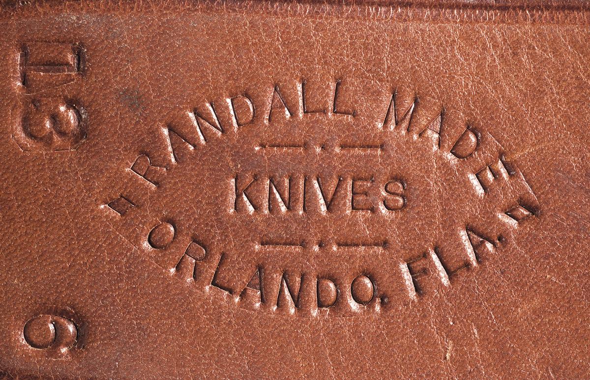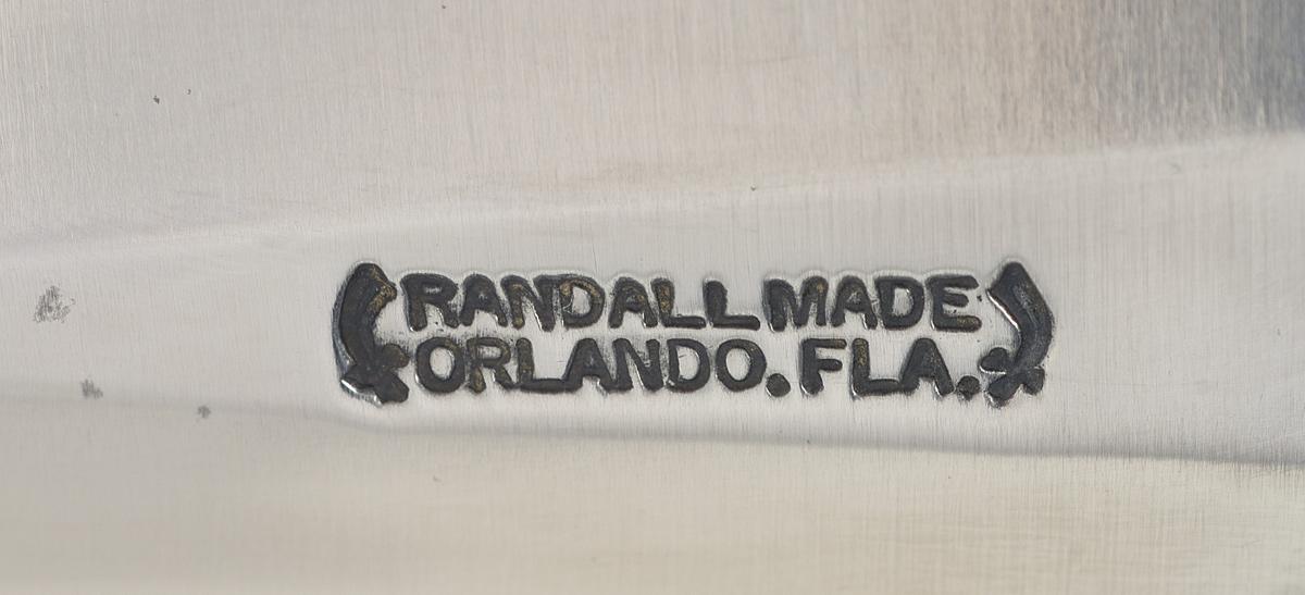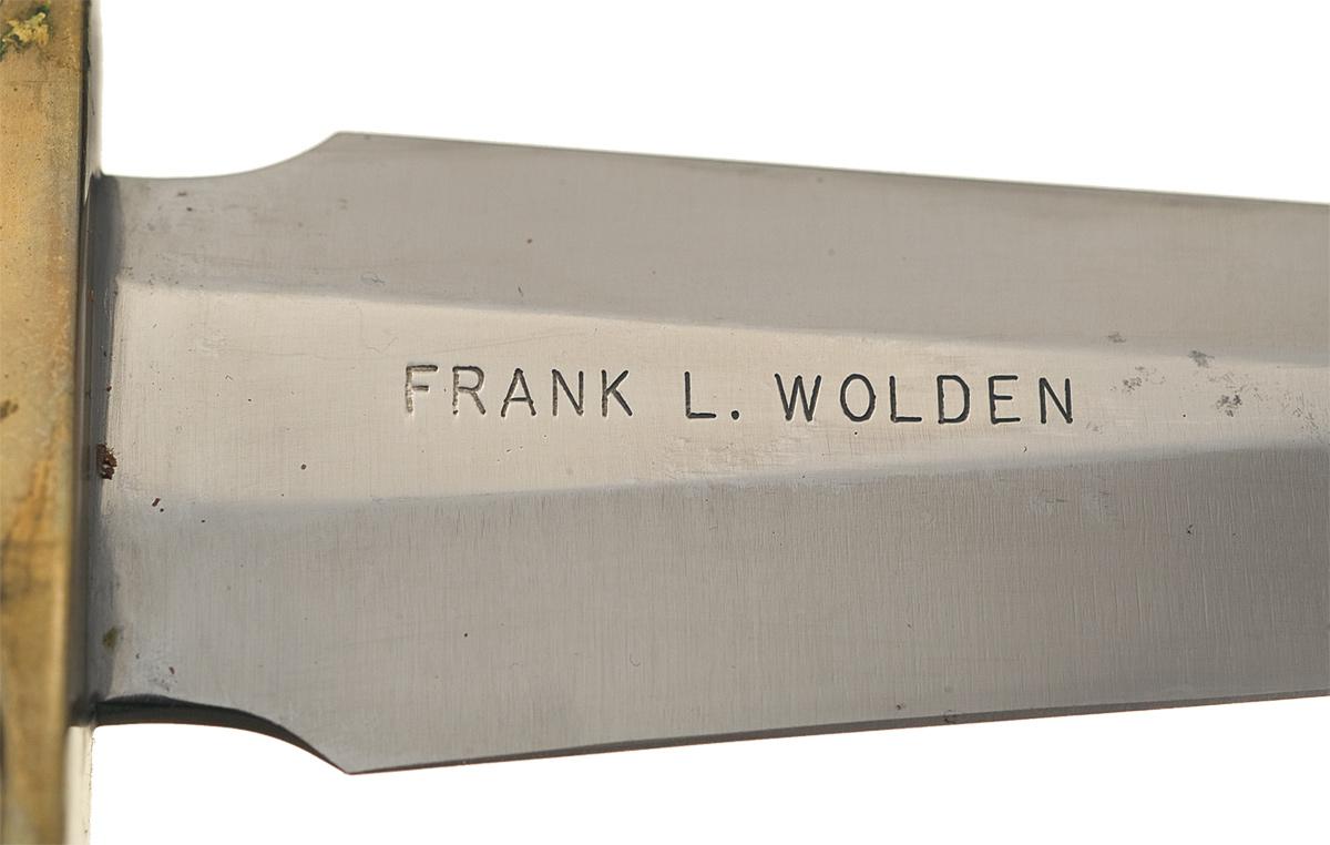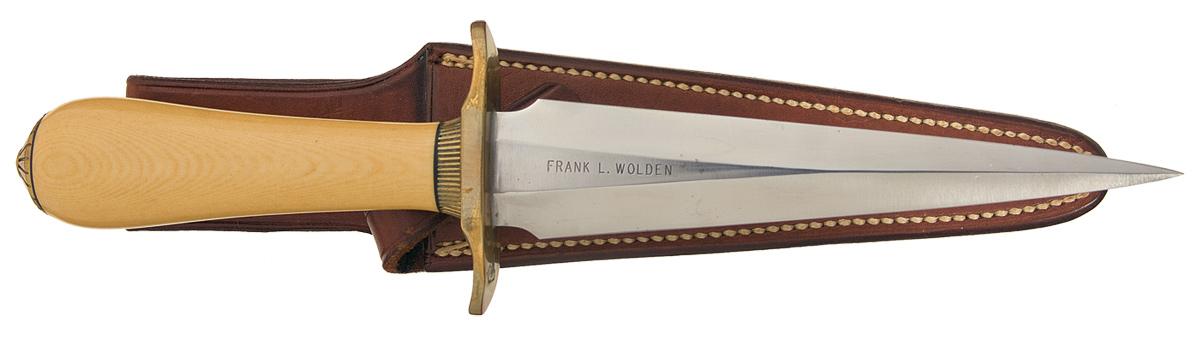 6 inch long double edged blade that is 1 2/5 inches wide at the base. The blade has the two line scimitar flanked Randall marking on the left side and "FRANK L. WOLDEN" on the reverse. Simulated ivory grip, with brass cross guard with slight downward turn and brass butt with decorative sunburst pattern. OAL: 11 3/4". Complete with a properly marked brown leather Randall sheath.