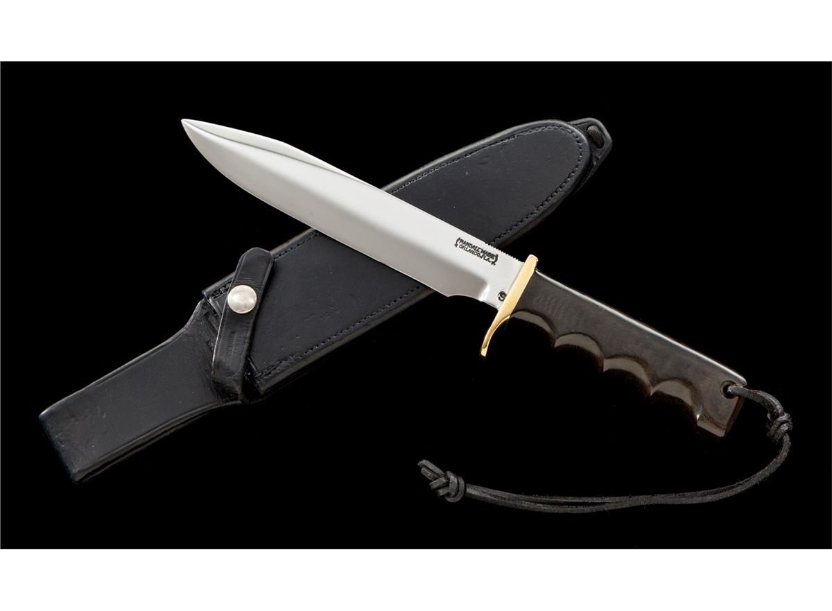 Vietnam War Era Randall Model 16 ''Dive'' Knife, 7'' stainless steel blade is marked ''RANDALL MADE/ORLANDO, FLA.'' with a ''Low S'' above the choil. The reverse is marked ''STEPHEN MELINDER/HOUSTON, TEXAS-1967.'' The overall length is 11-1/2''. Brown micarta handle, brass half guard, and brown leather boot lace style wrist thong. Black Johnson rough back, waxed, no hone sheath with the ''Randall'' football-shaped logo and ''16'' on the back side of the belt loop. Additionally the previous owners name is also neatly stamped on the front and back side of the belt loop and keeper strap. Smooth snap and black leg wrap. Condition is fine, showing signs of use. Blade appears to have been lightly and professionally cleaned. Sheath with minor scuffs and scratches, snap is crisp, with tight stitching and seams. Est.: $1,500-$1,800.