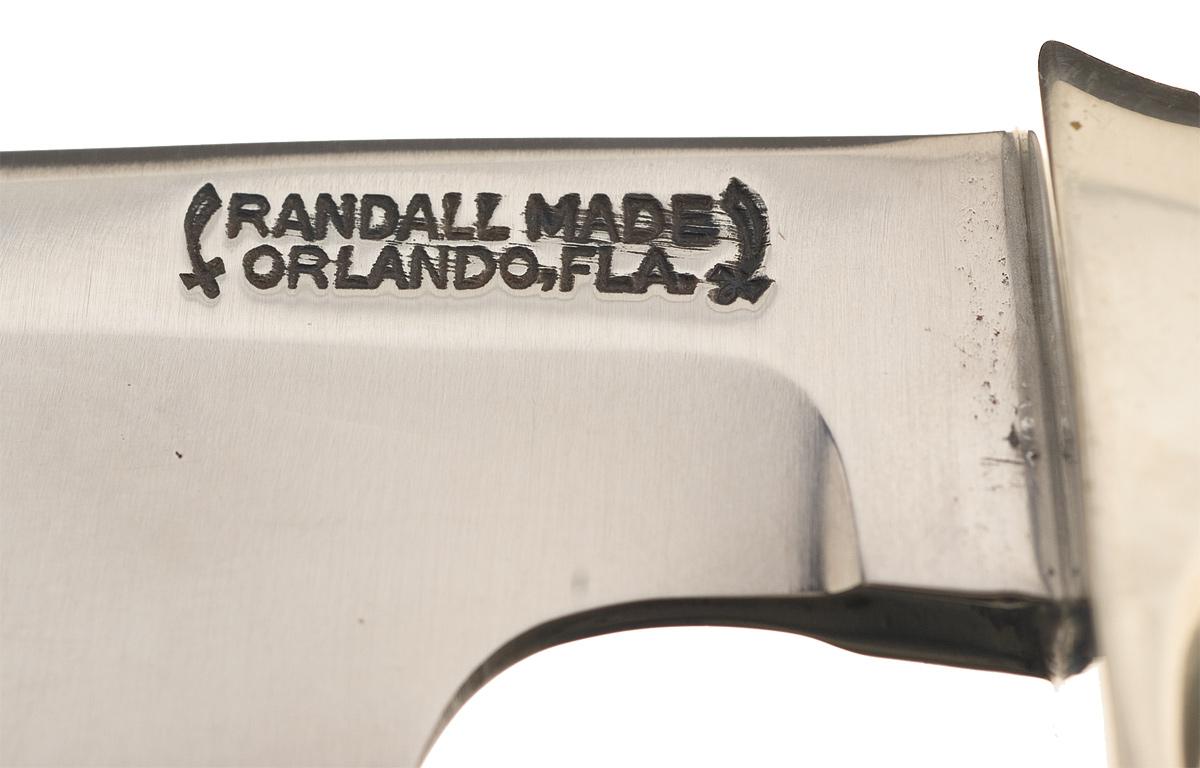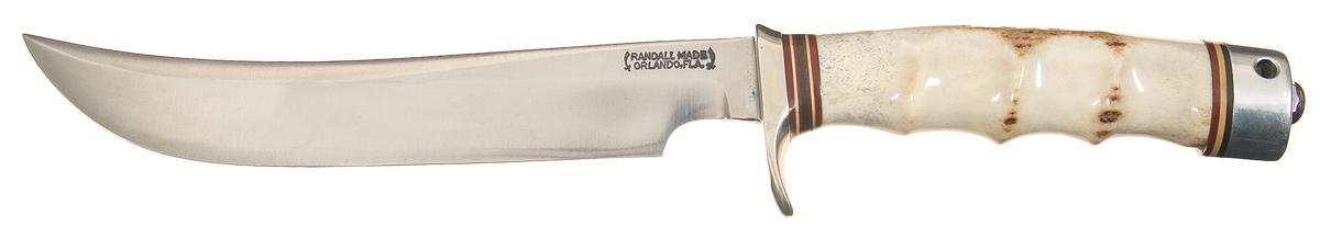 This early 1960s production Randall Model 4 knife has a 7 inch carbon blade marked with the standard two line Randall address. Finger groove stag handle with duralumin butt. OAL: 12".