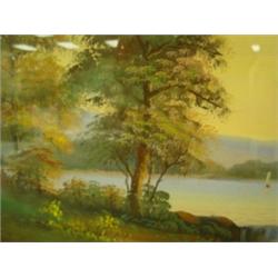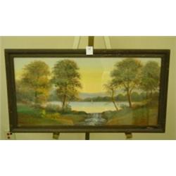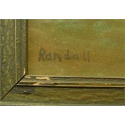 Pastel landscape. Signed Randall. Typical of work done by itinerant artists in rural areas at the turn of the last century. Most hung on farmhouse walls as did this one. Inscription on back dates to 1925, Ohio. 16" x 30". Original frame. Condition: Excellent