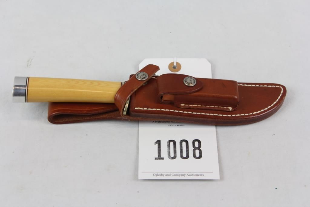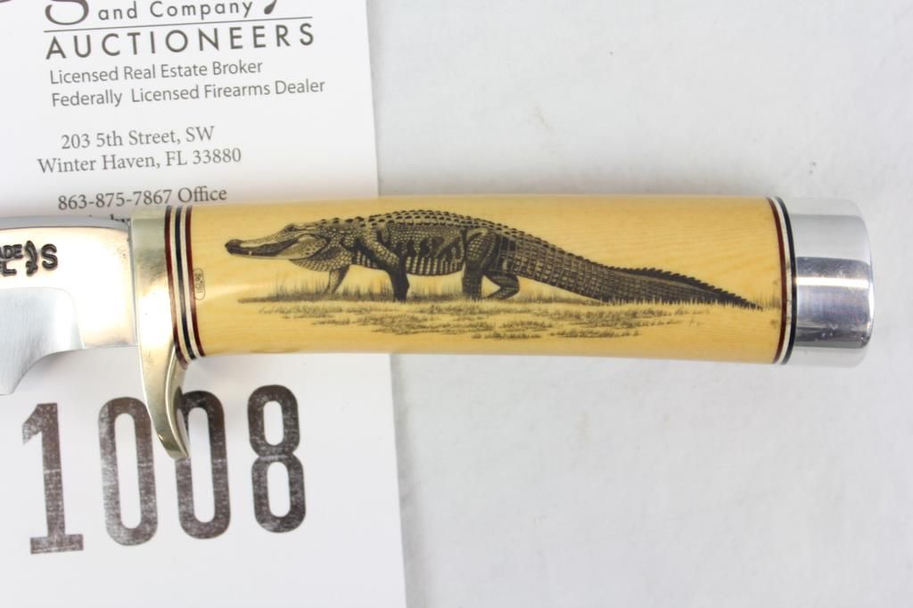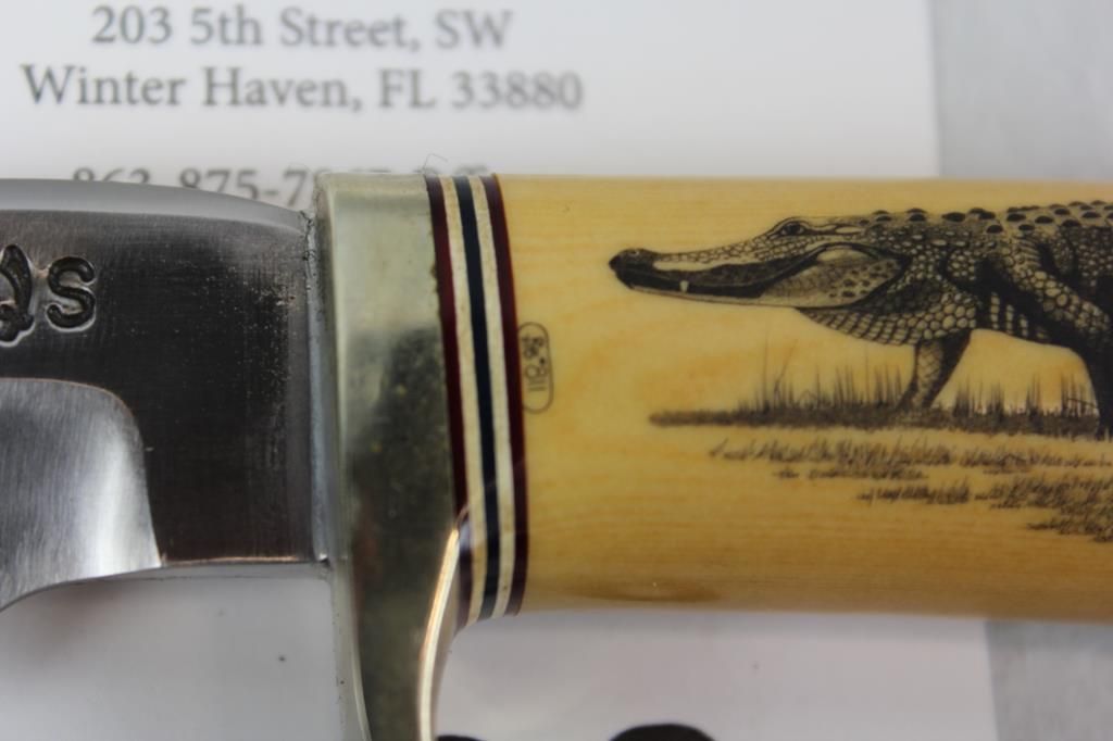 Bull Gator - Randall Knife with Fine Scrimshaw by Rick Bowles. This knife appears to be new & unused. MINT Condition. More details coming soon. Go to RBScrim.com for more information on this incredible artist.