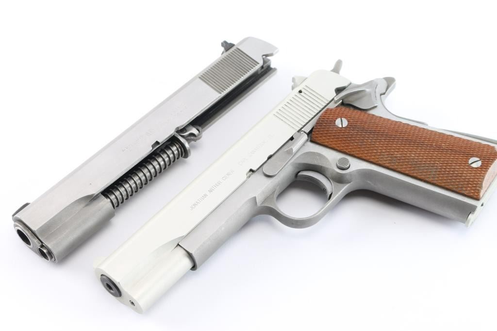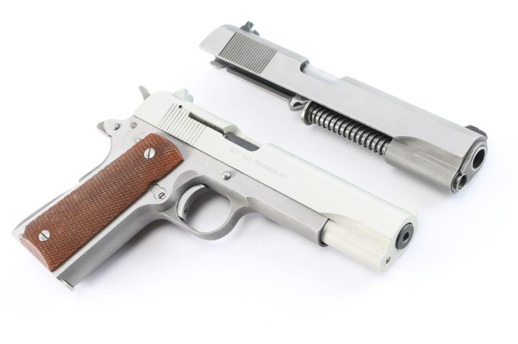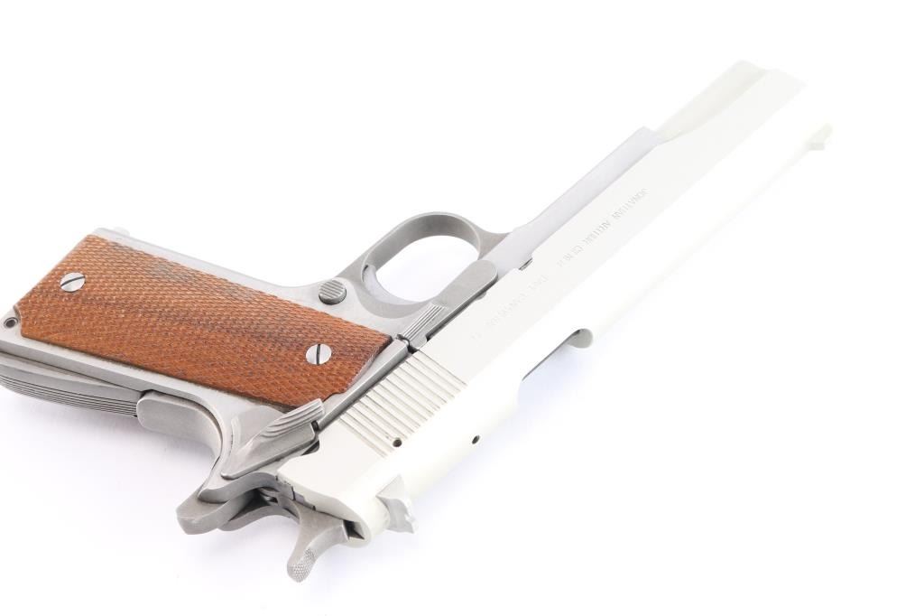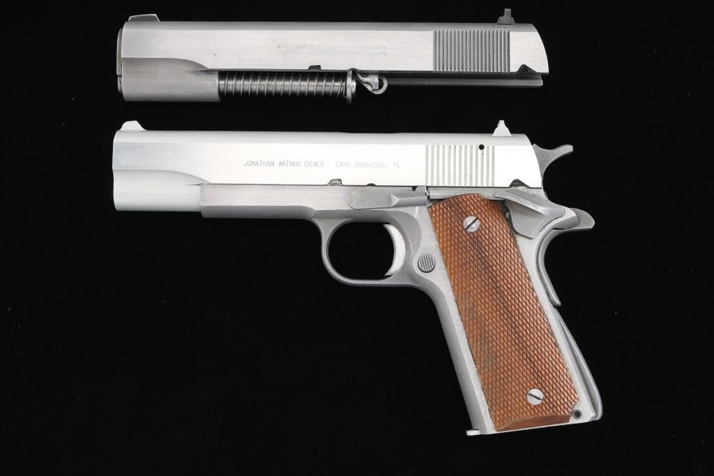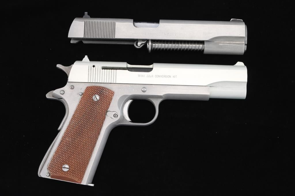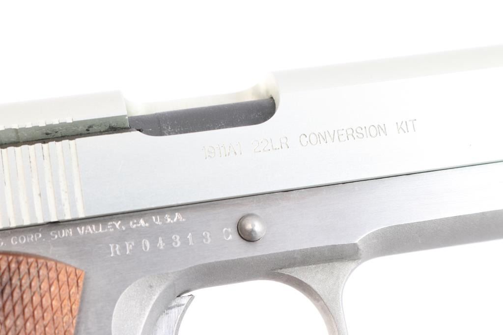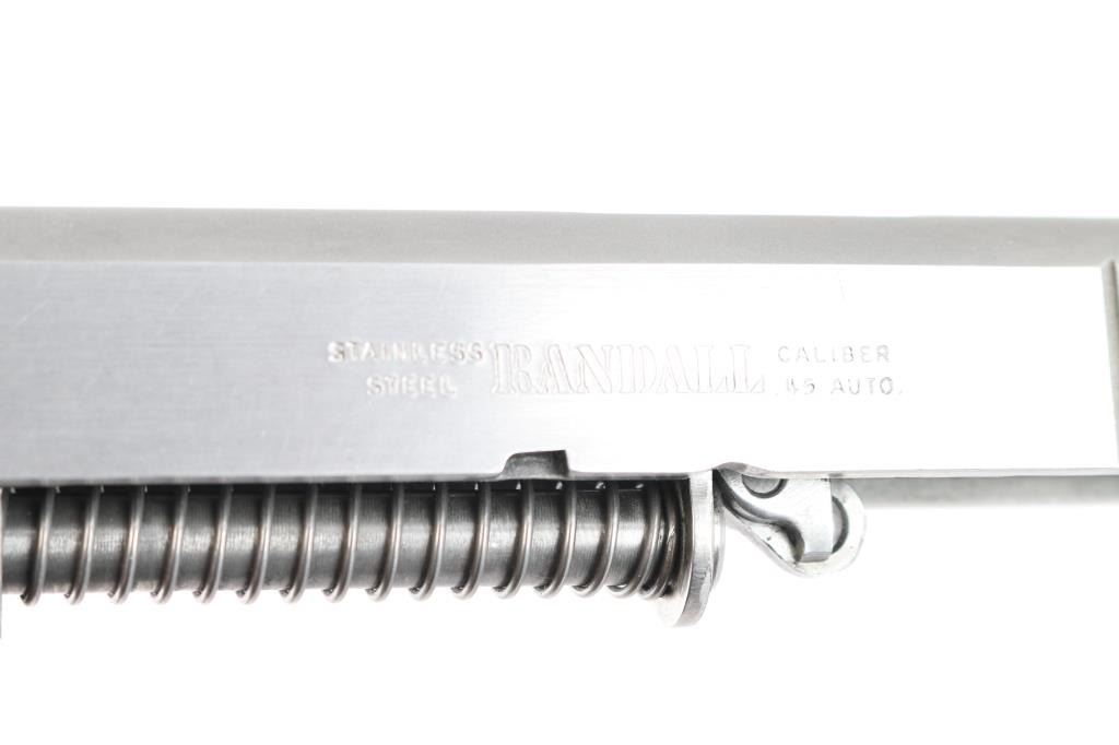 American made 1911 style stainless semi-automatic pistol produced by Randall Firearms (out of production) out of Sun Valley, CA. This pistol comes with an extra complete slide package, it has a .22 Long Rifle conversion barrel and slide assembly, and the original .45 ACP slide configuration seperate. The frame is stainless with a smooth front strap, serrated mainspring housing, GI hammer with checkered spur, serrated push button magazine release, serrated curved trigger, and smooth GI specification grip safety. Grips are checkered hardwood with slot screws. The .22 LR 'Jonathan Arthur Ciener' conversion package includes an aluminum slide, integral blade front sight, notched dovetailed rear sight, black bull barrel, and metal guide rod. The original .45 ACP Randall slide package includes a stainless steel slide, stainless barrel, full length steel guide rod, blade front sight, standard coil spring, and notched dovetailed rear sight. The Randall .45 ACP bore is bright with strong rifling, and the conversion barrel also looks bright with strong rifling. The grips are in excellent condition with extremely minor handling marks. The action is smooth and crisp, but the .22 LR magazine is hard to insert into the pistol. The stainless condition on the slide and frame are very good to excellent with approximately 98% of the finish condition retained. Only superficial scratches can be found on the frame where there is heavier scratches on the slide, and the front sight looks to be ground down. The aluminum slide shows no remarkable scratches or blemishes.
