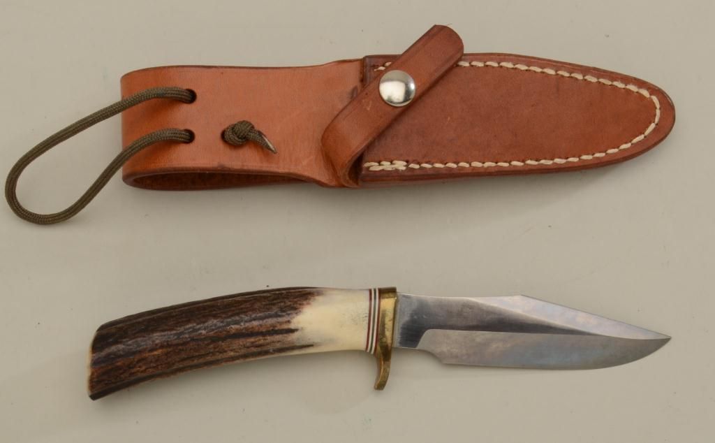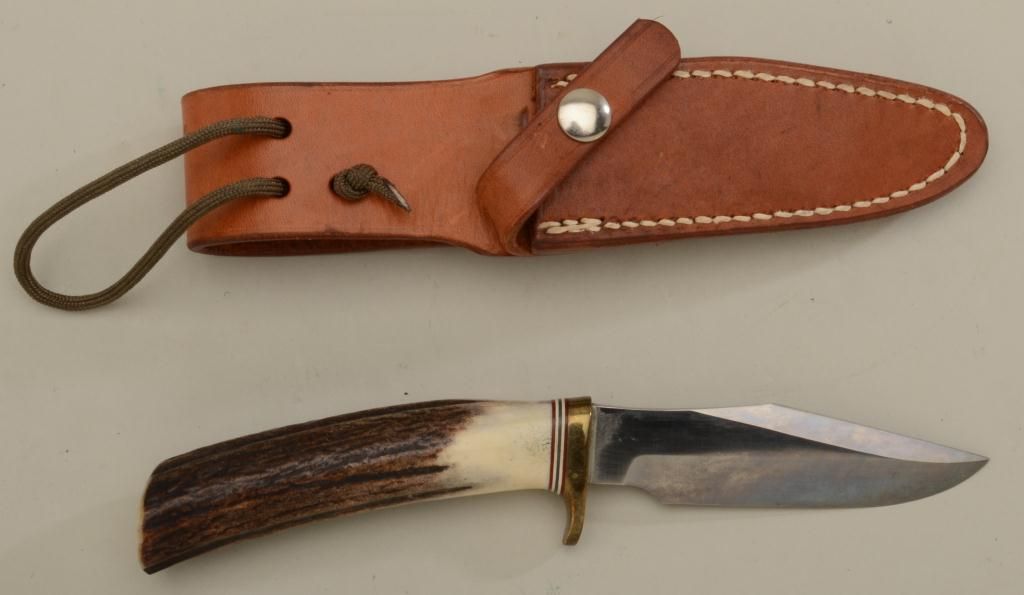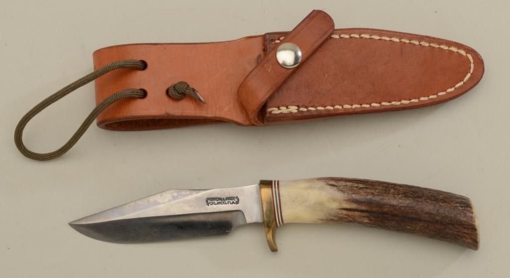 Randall knife with leather sheath (Orlando, FLA) in fine condition; knife is approx. 8-1/2” overall with an approx. 4” blade; sheath is fine. Est.: $350-$700.