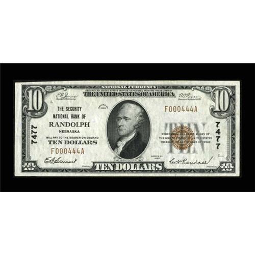 <B>Randolph, NE</B></I> - $10 1929 Ty. 1 <B>The Security NB</B></I> Ch. # 7477<BR> Three folds and some minor handling are noted on this AU looking issue. The paper is original, well embossed, and well margined. <B>Very Fine.</B></I><BR><BR><b>Shipping:</b> Coins & Currency (<a target="_blank" href="http://www.heritageauctions.com/common/shipping.php">view shipping information</a>)
