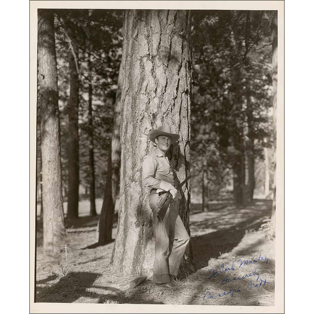 Vintage glossy 8 x 10 photo of Scott leaning against a tree, rifle in hand, signed and inscribed in fountain pen, “To Carl Masley, Sincerely, Randolph Scott.” Scattered surface and corner creasing, otherwise fine condition.