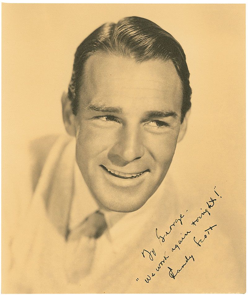 Vintage matte-finish head-and-shoulders 7.25 x 8.75 photo of the cheery actor, playfully signed and inscribed to assistant director George Rhein in fountain pen “To George, ‘We work again tonight!’ Randy Scott.” In fine condition, with trimmed edges, and tape remnants from scrapbook removal on the reverse.