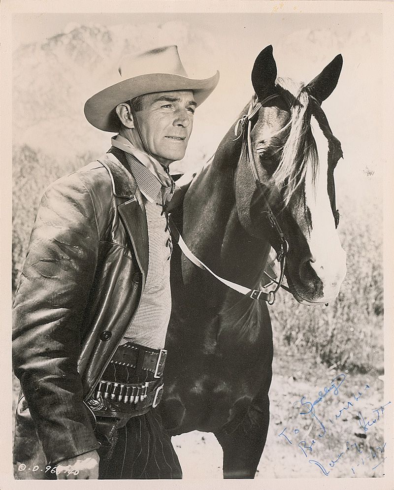 Vintage matte-finish 8 x 10 photo of Scott with his horse, signed and inscribed in fountain pen “To Sally, Best wishes, Randy Scott 1-1-62.” Rippling to top edge and mild contrast to the light, but legible, signature and inscription otherwise fine condition.