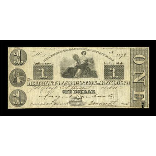 <B>Randolph, TN- Merchants Association of Randolph </B></I>$1 Jan. 3, 1838 Garland 112<BR> Evenly circulated paper reveals boldly printed devices and sufficiently strong penned signatures. The paper is whole, save for a chink into the design at lower right. <B>Very Good-Fine.</B></I><BR><BR><b>Shipping:</b> Coins & Currency (<a target="_blank" href="http://www.heritageauctions.com/common/shipping.php">view shipping information</a>)