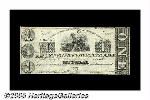 <B>Randolph, TN- Merchants Association of Randolph</B></I> $1 Feb. 22, 1838 Garland 112<BR>This is a scarce note from this Tipton County hamlet, with this example sporting even wear and wholesome edges. <B>Very Fine.</B></I>