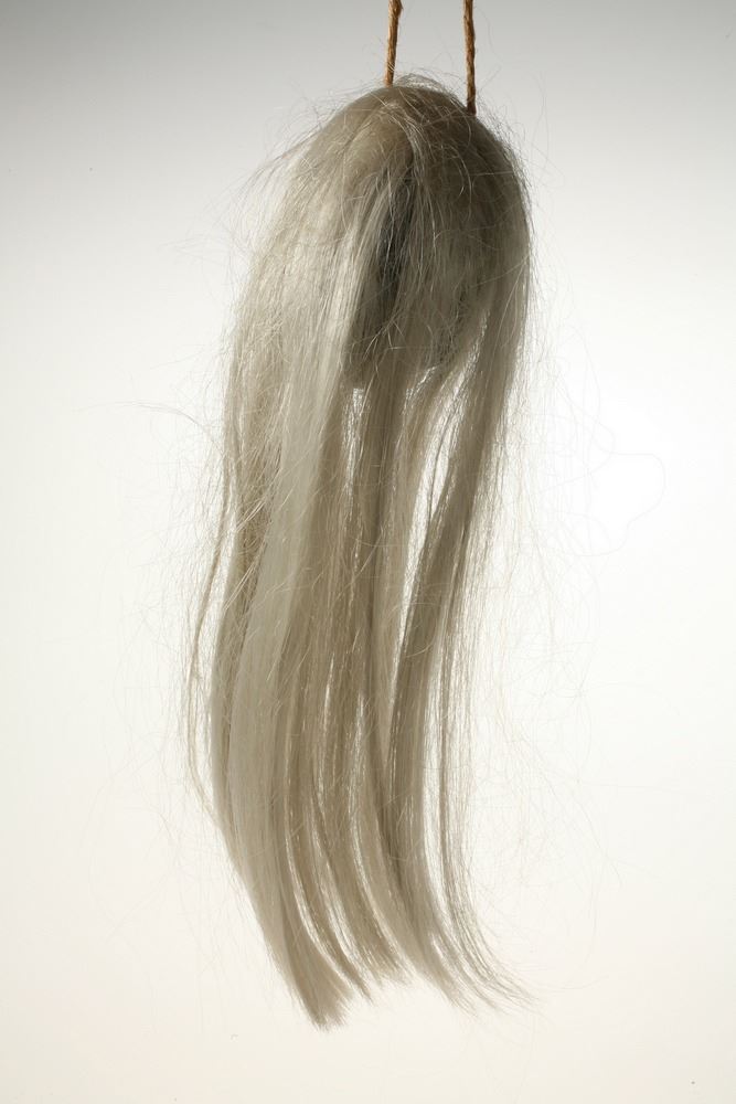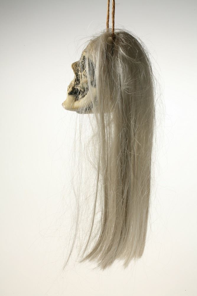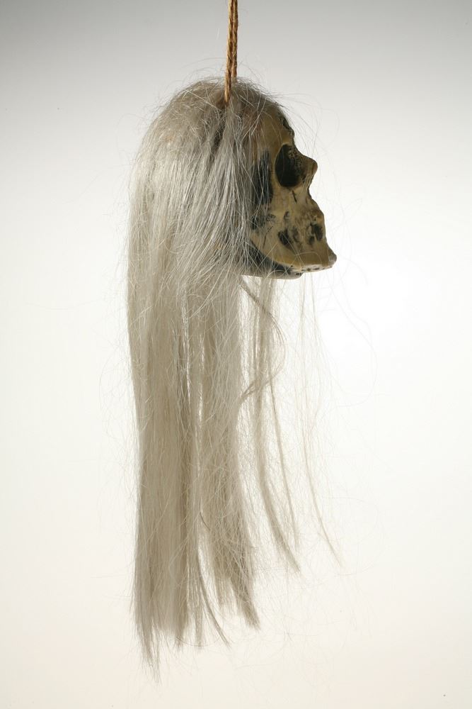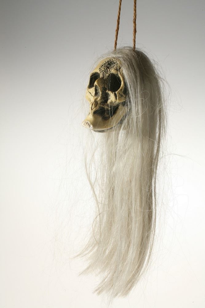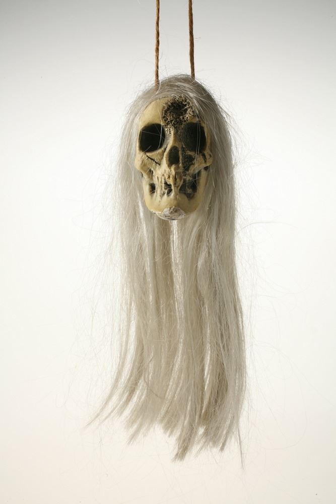 (Disneyland, 1969) Light hair version of Randotti's “Ivan, the Hairy One” glow in the dark skull. Has a rope attached for hanging. Measures 3.5"x2.25" and 3.5" tall. Hair measures 14" long. In good condition with some wear to the chin and base.