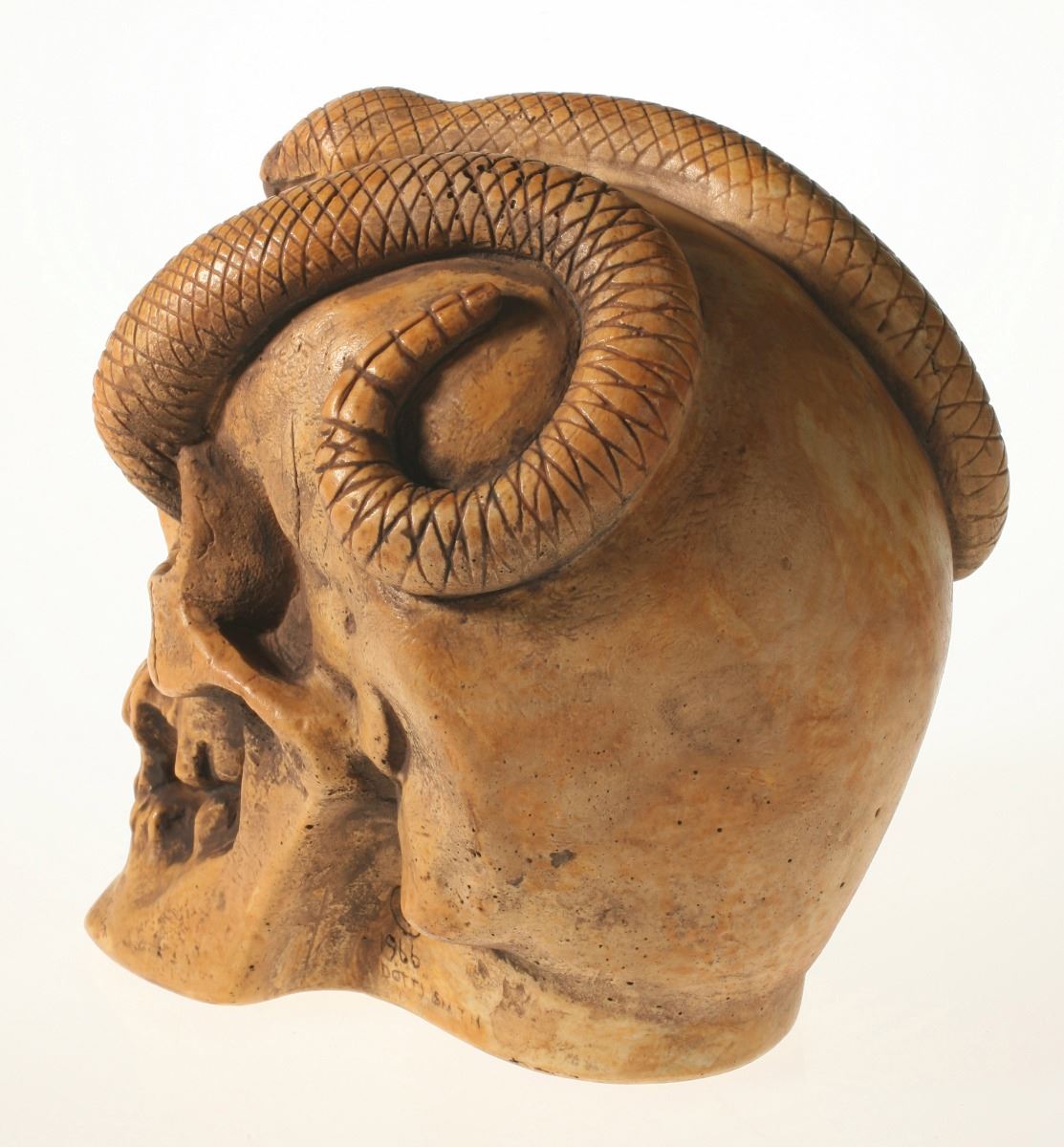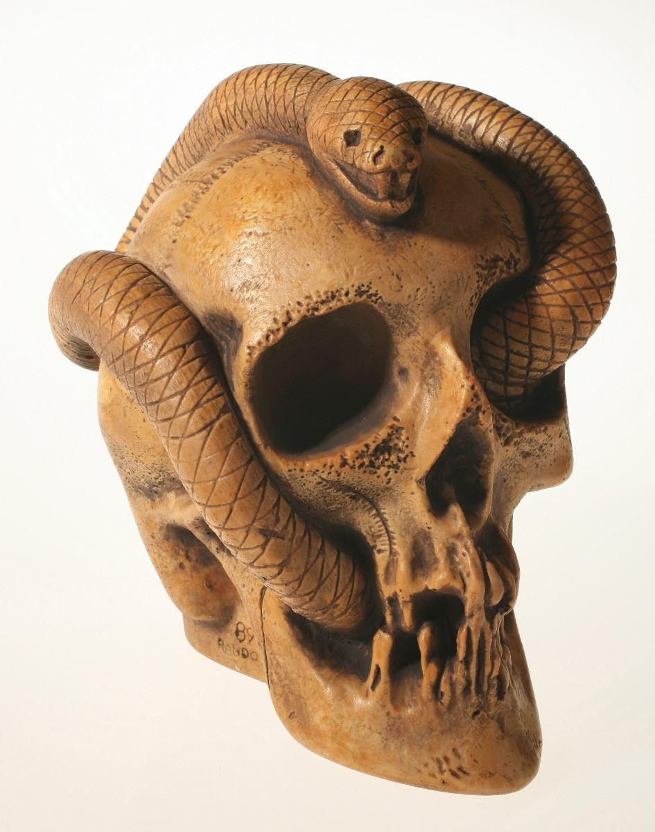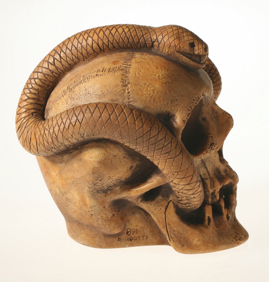 (Disneyland, 1966) Randotti large glow in the dark skull with snake. Dark toned with brown paint. Measures 5.5"x5.25" and 6.25" tall. In very fine condition.