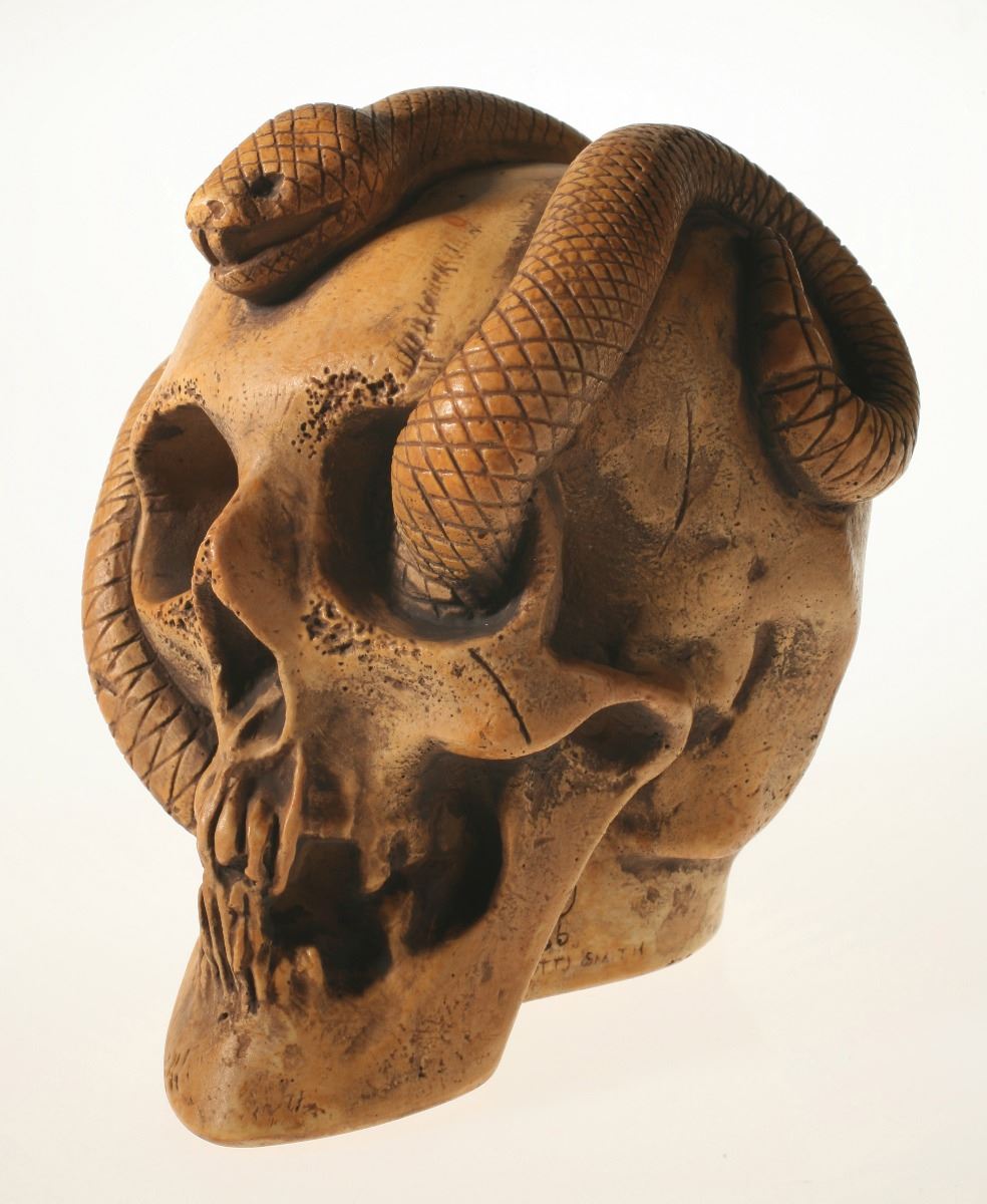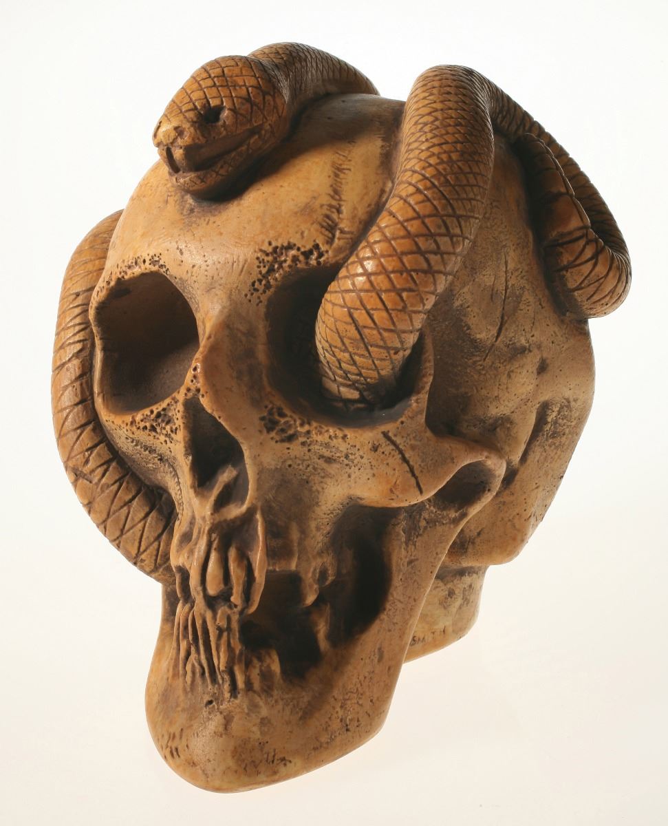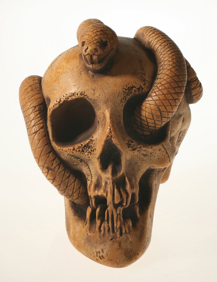 (Disneyland, 1966) Randotti large glow in the dark skull with snake. Dark toned with brown paint. Measures 5.5"x5.25" and 6.25" tall. In very fine condition.