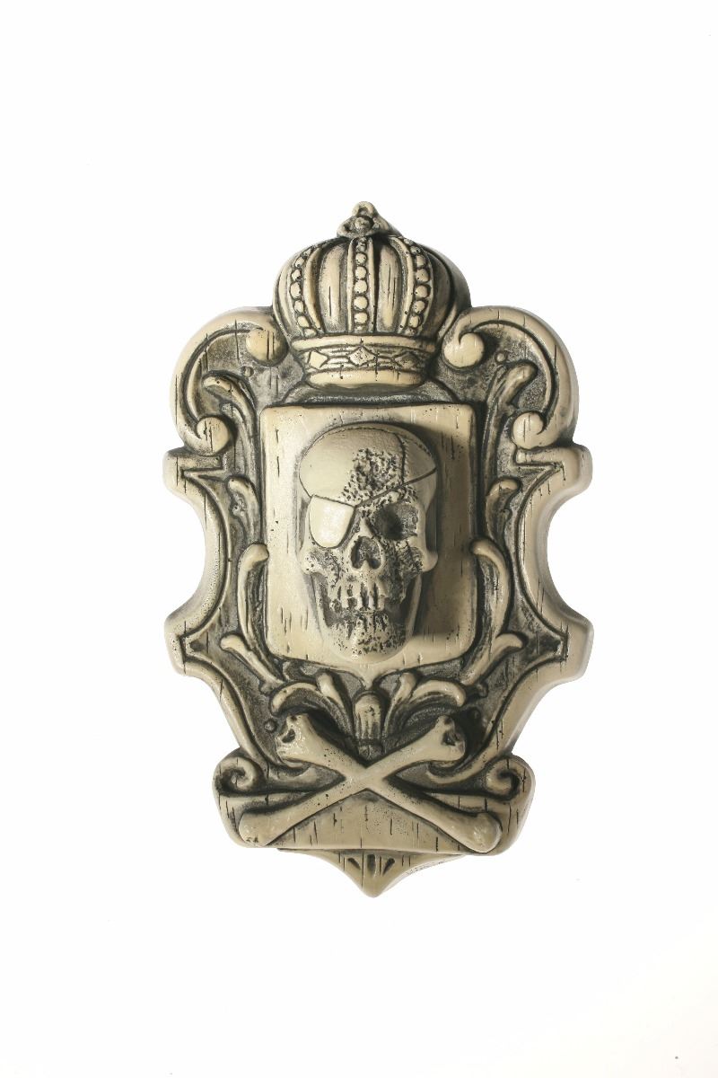 (Disneyland, 1968) Randotti glow in the dark pirate skull wall plaque. Ready to hang on the wall. Measures 5"x2" and 8" tall. In very fine condition.