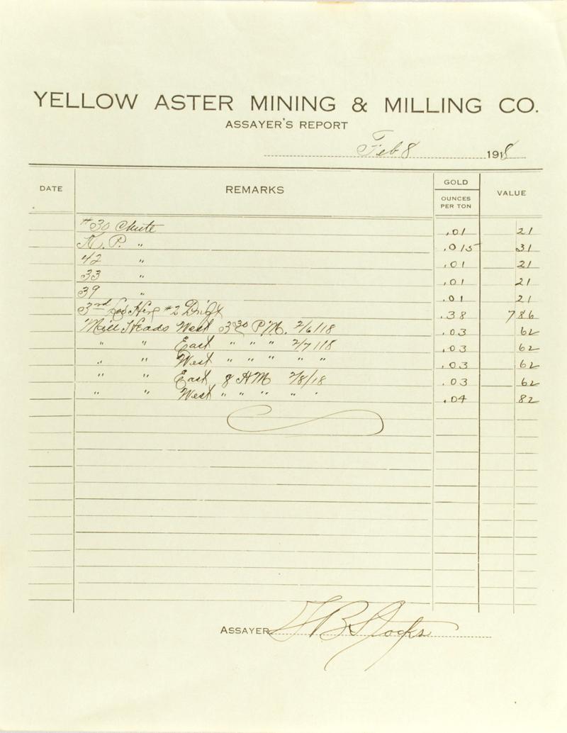 Lot of 10. 1) Issued. Signed by assayer J.B. Stocks. Value of gold ounces per ton. 2) Issued Feb 6, 1918. Signed Stocks. 3) Issued Feb 5, 1918. Signed Stocks. 4) Issued Feb 4, 1918. Signed Stocks. 5) Issued Mar 5, 1918. Signed by assayer W.H. McCombs. 6) Issued Apr 12, 1918. Signed McCombs. 7) Issued Apr 10, 1918. Signed McCombs. 8) Issued Apr 6, 1918. Signed McCombs. 9) Issued Apr 14, 1918. Signed McCombs. 10) Issued Apr 7, 1918. Signed McCombs. Yellow Aster was easily the largest and richest of the southern California gold mines. The company was managed by John Singleton, though the business aspects were managed by a woman, Mrs. Rose Burcham, who ruled the company’s finances with a steel fist. She was so successful that she upset all the competitors because she would not cut friendly deals for stock and made the original founders millions. These sheets show how and why this one deposit went to open status. It is of low grade quality.