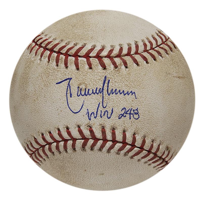 Official Rawlings game-used Major League baseball, from the April 24, 2005, game between the Texas Rangers and the New York Yankees, signed in blue ballpoint on the sweet spot, “Randy Johnson, Win 248.” In fine condition, with expected scuffing, soiling, and wear, and Steiner and MLB holograms affixed to ball. Pre-certified Steve Grad/PSA/DNA and RRAuction COA.
