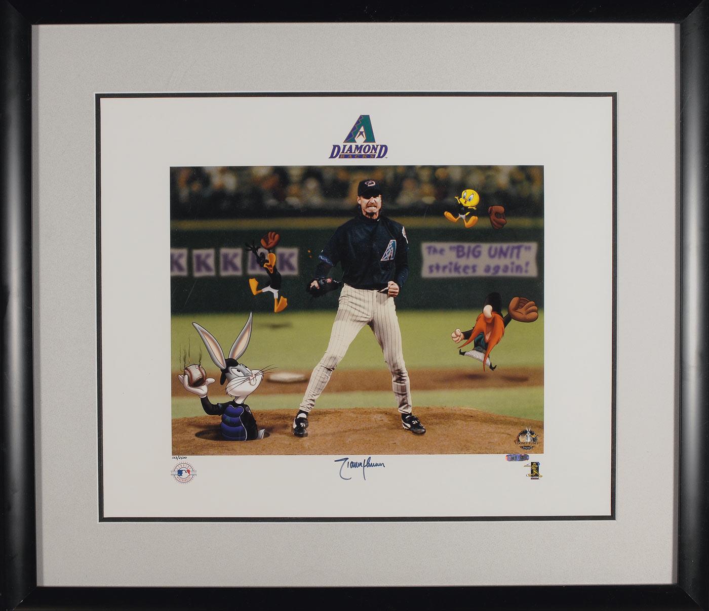 Color limited edition 21 x 17.5 lithograph entitled ‘The Big Unit,’ showing Johnson on the mound for Arizona surrounded by Bugs Bunny and some friends, numbered #403/2500, signed in the lower border in black felt tip by Johnson. Double matted and framed to an overall size of 30 x 26.5. In very fine condition. Oversized.