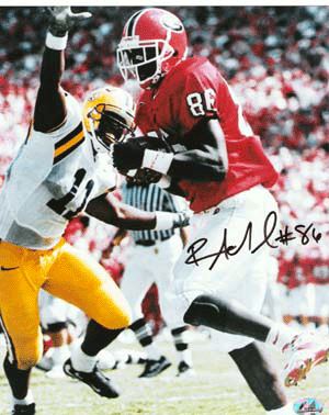 Randy McMichael earned First-team Freshman All-America honors from The Sporting News and SEC coaches. As a sophomore in 2000, McMichael hauled in 32 passes for 475 yards and a score, earning an honorable mention All-conference selection. He was a First-team All-SEC selection by the Associated Press and SEC coaches in his final year of 2001 when he started nine of the ten games in which he appeared and had 24 receptions for 281 yards and a touchdown. McMichael started 21 of the 33 games in which he played during his career and caught 90 passes for 1,213 yards and five touchdowns. He finished ranked ninth in school history for career receiving yards. Randy McMichael has hand autographed this Georgia Bulldogs 8x10 Color Photo. Famous Ink Hologram and Certificate of Authenticity from Athlon Sports.