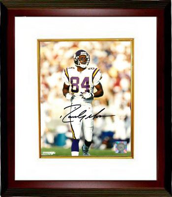 Randy Moss was drafted by the Minnesota Vikings in the first round of the 1998 NFL Draft. Moss played the first seven years of his career in Minnesota before a trade in 2005 brought him to the Oakland Raiders. On April 29, 2007, Moss was traded to the New England Patriots for a fourth-round draft pick. On October 6, 2010, Moss returned to the Vikings in a trade from the Patriots. However, his stint in Minnesota was short-lived, as he was waived by the team less than a month later, and claimed by the Tennessee Titans.Moss holds the NFL single season touchdown reception record (23, set in 2007), and the NFL single-season touchdown reception record for a rookie (17, in 1998). Randy Moss hand autographed Minnesota Vikings 8x10 Photo. Certificate of Authenticity from Athlon Sports. Custom White Mat and Premium Mahogany Frame as shown.