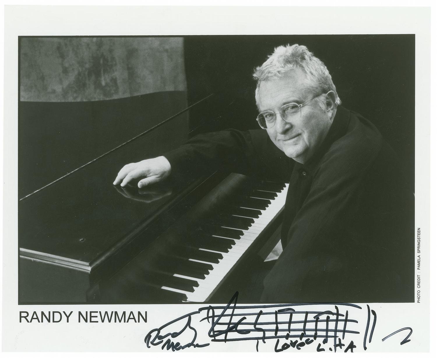 Satin-finish 10 x 8 photo of Newman seated at a piano, signed in the lower border in black felt tip, with Newman adding a three bar AMQS from ‘I Love L.A.’ In very fine condition.