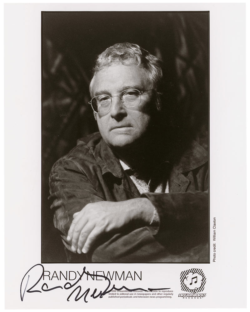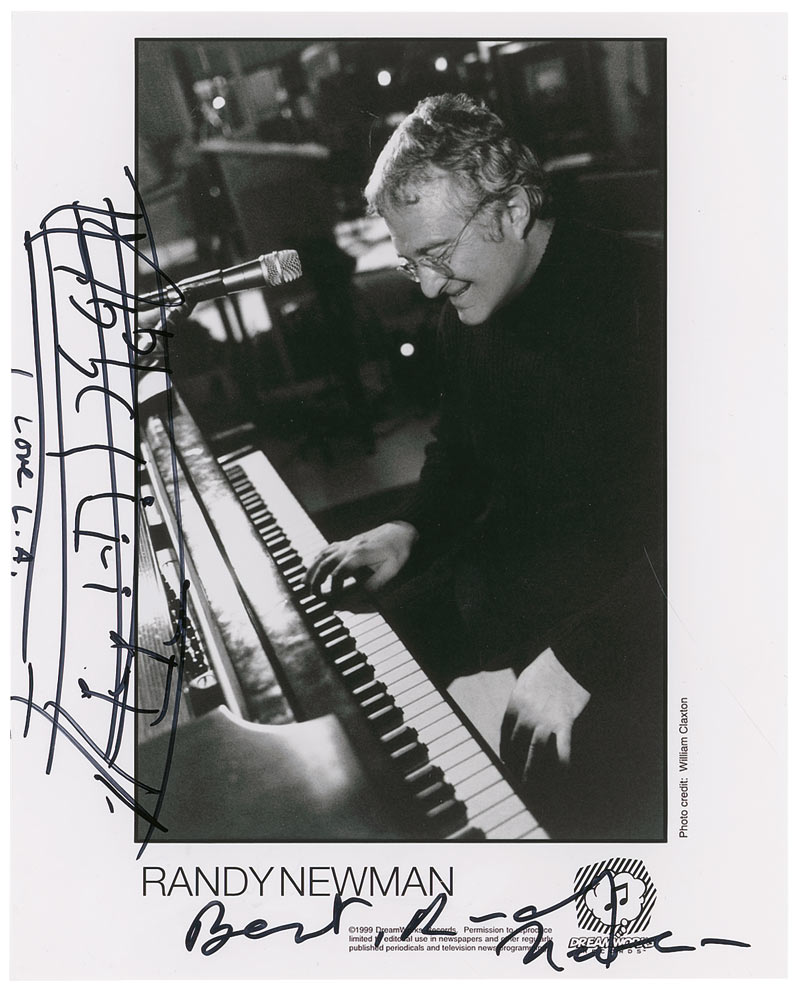 Two satin-finish 8 x 10 Dreamworks Records publicity photos of Randy Newman, one at his piano and the other a more serious head-and-torso pose, each signed in black felt tip in the bottom border, with Newman adding a two-bar AMQS from ‘I Love L. A.” to the photo of him at the piano. In fine condition, with the slightest surface impressions.
