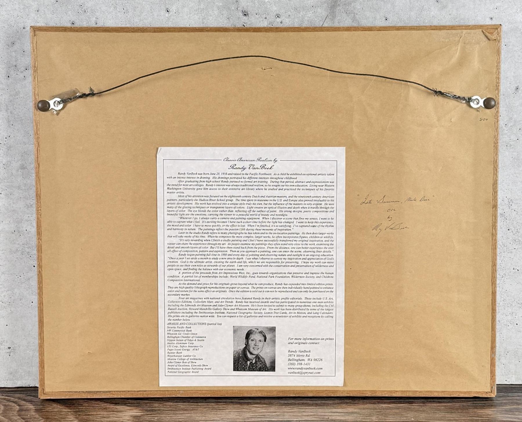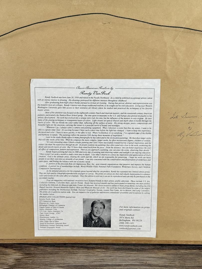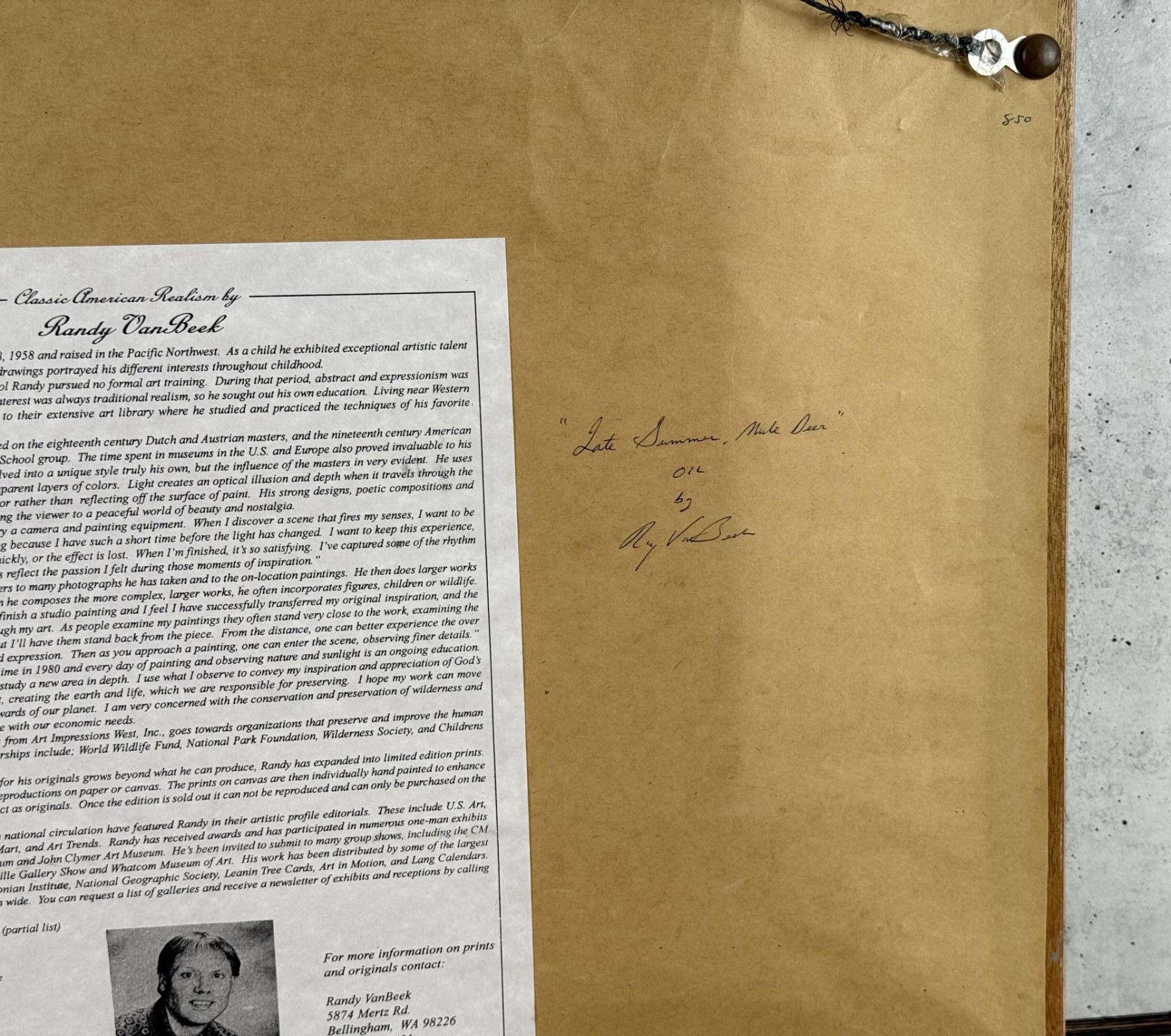 Title is Late Summer Mule Deer. 8" by 12" unframed. 17" by 21" framed. Oil on Board. Randy Van Beek (Born 1958) is active/lives in Washington. Randy Van Beek is known for Western landscape painting-Indian encampments. Randy Van Beek was born June 28, 1958, and raised in the Pacific Northwest. As a child he exhibited exceptional artistic talent with a specific interest in drawing. His drawings portrayed his different interests throughout childhood. After graduating from high school, Randy pursued no formal art training. During that period, Abstraction and Expressionism were the trends for most art colleges. Randy's interest was always Traditional Realism, so he sought out his own education. Living near Western Washington University gave him access to their extensive art library where he studied and practiced the techniques of his favorite master artists. Most of his attention was focused on the eighteenth century Dutch and Austrian masters, and the nineteenth century American painters, particularly the Hudson River School Group. The time spent in museums in the U.S. and Europe also proved invaluable to his artistic development. His work has evolved into a unique style truly his own, but the influence of the masters is evident. He uses many of the glazing techniques or transparent layers of colors. An illusion of depth is created as light travels through these layers of transparent color instead of immediately reflecting off of an opaque surface. He is continually striving to improve in composition, which is the most intellectual aspect in painting---the design and arrangement of dark and light masses, the harmonious union of line, form and color to which a viewer is attracted. He develops the composition to communicate a message or a sensation. Of his working method, he said: "Whenever I travel I carry my painting equipment and camera. When I discover a scene or an effect that excites me, something unique, I attempt to capture what I feel or the impression of my visual experience." Later in the studio Randy refers to the outdoor study paintings as well as the photographs to execute larger works. When he composes these more complex versions, he may incorporate figures, children, or wildlife, sometimes creating a story. Randy enjoys a broad range of subjects and painting styles. "I don't want to limit myself to a theme in subjects, or a repetitive formula in techniques. I need to continually challenge myself. The creative process is over once I've accomplished something, and it's that process I'm most passionate about. I think the creative mind is one of God's most fascinating gifts. I see it as a responsibility to explore and develop my gift, but mostly to share what I've created. We can seek solace in the appreciation of beauty. Art, music, and literature can elevate our spirit providing relief from the common place. A work of art is passed on for centuries, communicating ones personal insights in a particular era." Randy is concerned with the preservation of natural areas on our planet and hopes his work will inspire others to share in the responsibility of maintaining balance between conservation, economic, and social needs. A portion of the proceeds from Art Impressions West, Inc., goes toward organizations that preserve and improve wildlife habitat thus promoting our quality and enjoyment of life now and for future generations. A partial list of memberships include: World Wildlife Fund, National Park Foundation, Wilderness Society, Whatcom County Land Trust, and Children's Compassion International.