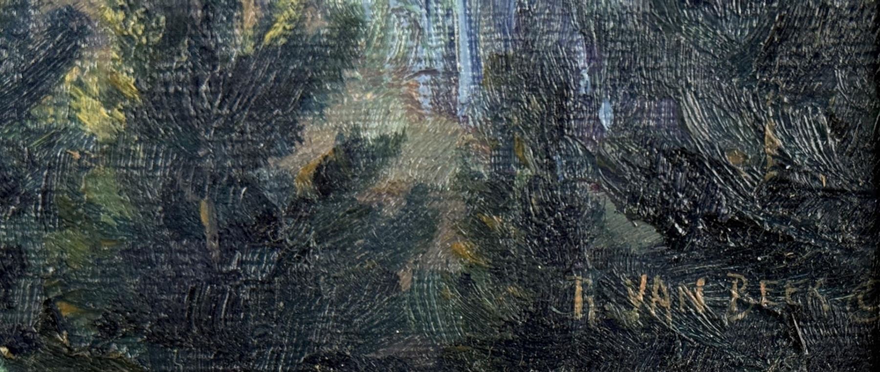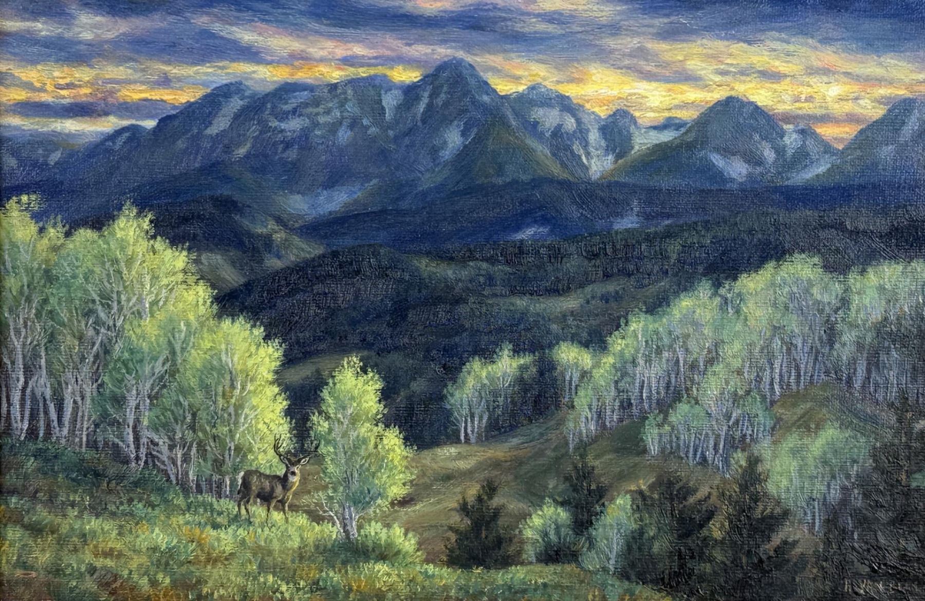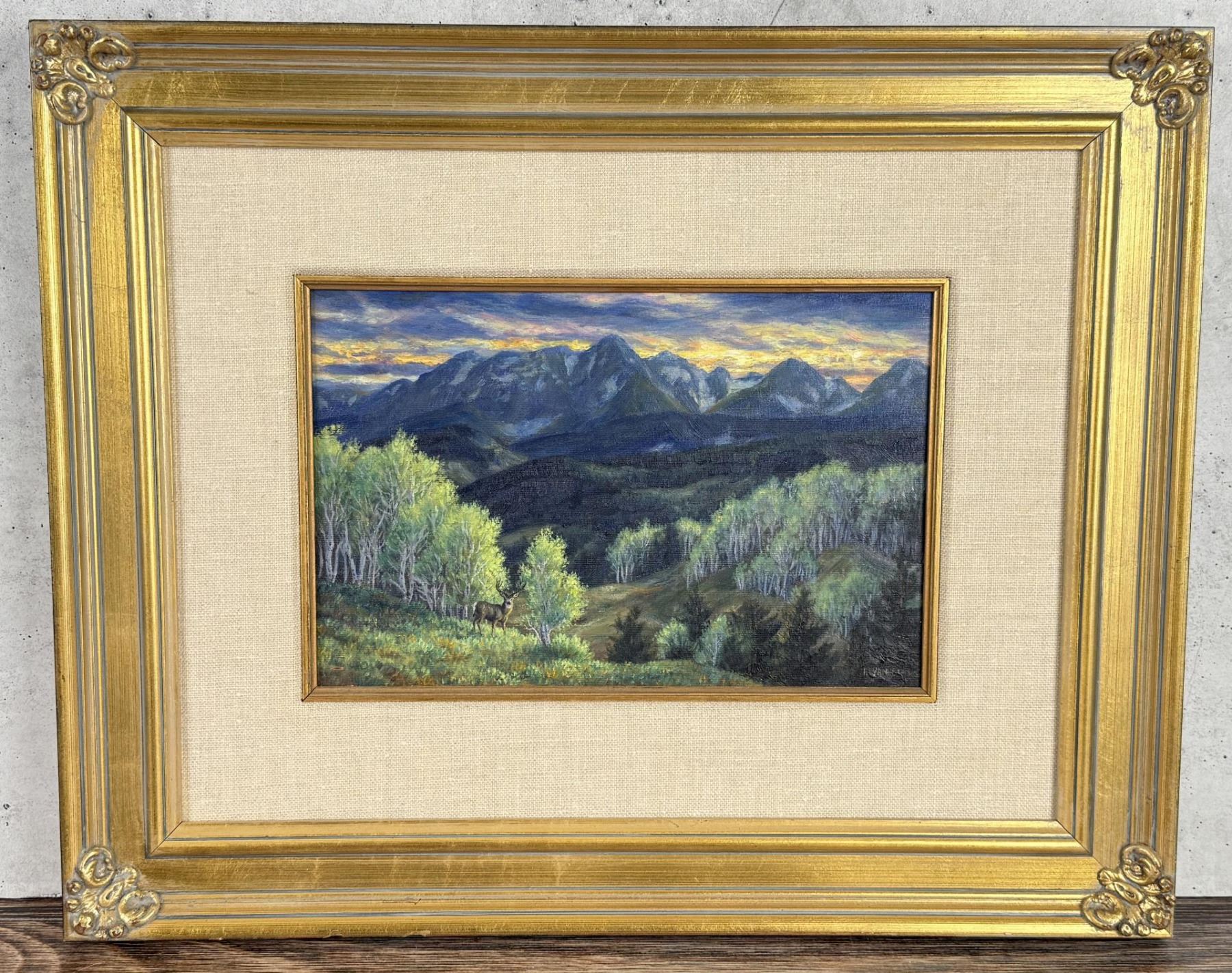 Title is Late Summer Mule Deer. 8" by 12" unframed. 17" by 21" framed. Oil on Board. Randy Van Beek (Born 1958) is active/lives in Washington. Randy Van Beek is known for Western landscape painting-Indian encampments. Randy Van Beek was born June 28, 1958, and raised in the Pacific Northwest. As a child he exhibited exceptional artistic talent with a specific interest in drawing. His drawings portrayed his different interests throughout childhood. After graduating from high school, Randy pursued no formal art training. During that period, Abstraction and Expressionism were the trends for most art colleges. Randy's interest was always Traditional Realism, so he sought out his own education. Living near Western Washington University gave him access to their extensive art library where he studied and practiced the techniques of his favorite master artists. Most of his attention was focused on the eighteenth century Dutch and Austrian masters, and the nineteenth century American painters, particularly the Hudson River School Group. The time spent in museums in the U.S. and Europe also proved invaluable to his artistic development. His work has evolved into a unique style truly his own, but the influence of the masters is evident. He uses many of the glazing techniques or transparent layers of colors. An illusion of depth is created as light travels through these layers of transparent color instead of immediately reflecting off of an opaque surface. He is continually striving to improve in composition, which is the most intellectual aspect in painting---the design and arrangement of dark and light masses, the harmonious union of line, form and color to which a viewer is attracted. He develops the composition to communicate a message or a sensation. Of his working method, he said: "Whenever I travel I carry my painting equipment and camera. When I discover a scene or an effect that excites me, something unique, I attempt to capture what I feel or the impression of my visual experience." Later in the studio Randy refers to the outdoor study paintings as well as the photographs to execute larger works. When he composes these more complex versions, he may incorporate figures, children, or wildlife, sometimes creating a story. Randy enjoys a broad range of subjects and painting styles. "I don't want to limit myself to a theme in subjects, or a repetitive formula in techniques. I need to continually challenge myself. The creative process is over once I've accomplished something, and it's that process I'm most passionate about. I think the creative mind is one of God's most fascinating gifts. I see it as a responsibility to explore and develop my gift, but mostly to share what I've created. We can seek solace in the appreciation of beauty. Art, music, and literature can elevate our spirit providing relief from the common place. A work of art is passed on for centuries, communicating ones personal insights in a particular era." Randy is concerned with the preservation of natural areas on our planet and hopes his work will inspire others to share in the responsibility of maintaining balance between conservation, economic, and social needs. A portion of the proceeds from Art Impressions West, Inc., goes toward organizations that preserve and improve wildlife habitat thus promoting our quality and enjoyment of life now and for future generations. A partial list of memberships include: World Wildlife Fund, National Park Foundation, Wilderness Society, Whatcom County Land Trust, and Children's Compassion International.