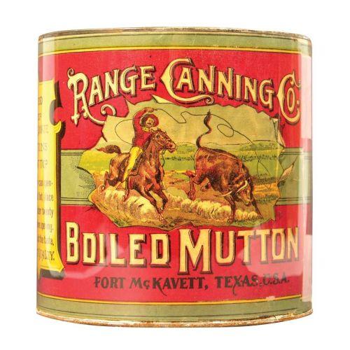 Range Canning Company Boiled Mutton. Ft. McKavett, TX. Paper label, excellent condition. 6 inches tall X 6 inch diameter.