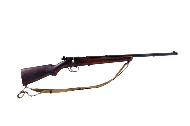 Ranger Cal .22 SN:NVSN Modified .22 caliber bolt action rifle with cut down stock for child's training rifle. Blued finish, smooth wood stock with finger groove fore arm and no butt plate, 20" barrel threaded at the muzzle with peep sight installed on thModified .22 caliber bolt action rifle with cut down stock for child's training rifle. Blued finish, smooth wood stock with finger groove fore arm and no butt plate, 20" barrel threaded at the muzzle with peep sight installed on the receiver,fair bore and working action, canvas sling added. Condition: Good with finish turning brown and some surface rust beginning. Stock is cut down and no butt plate has been added.