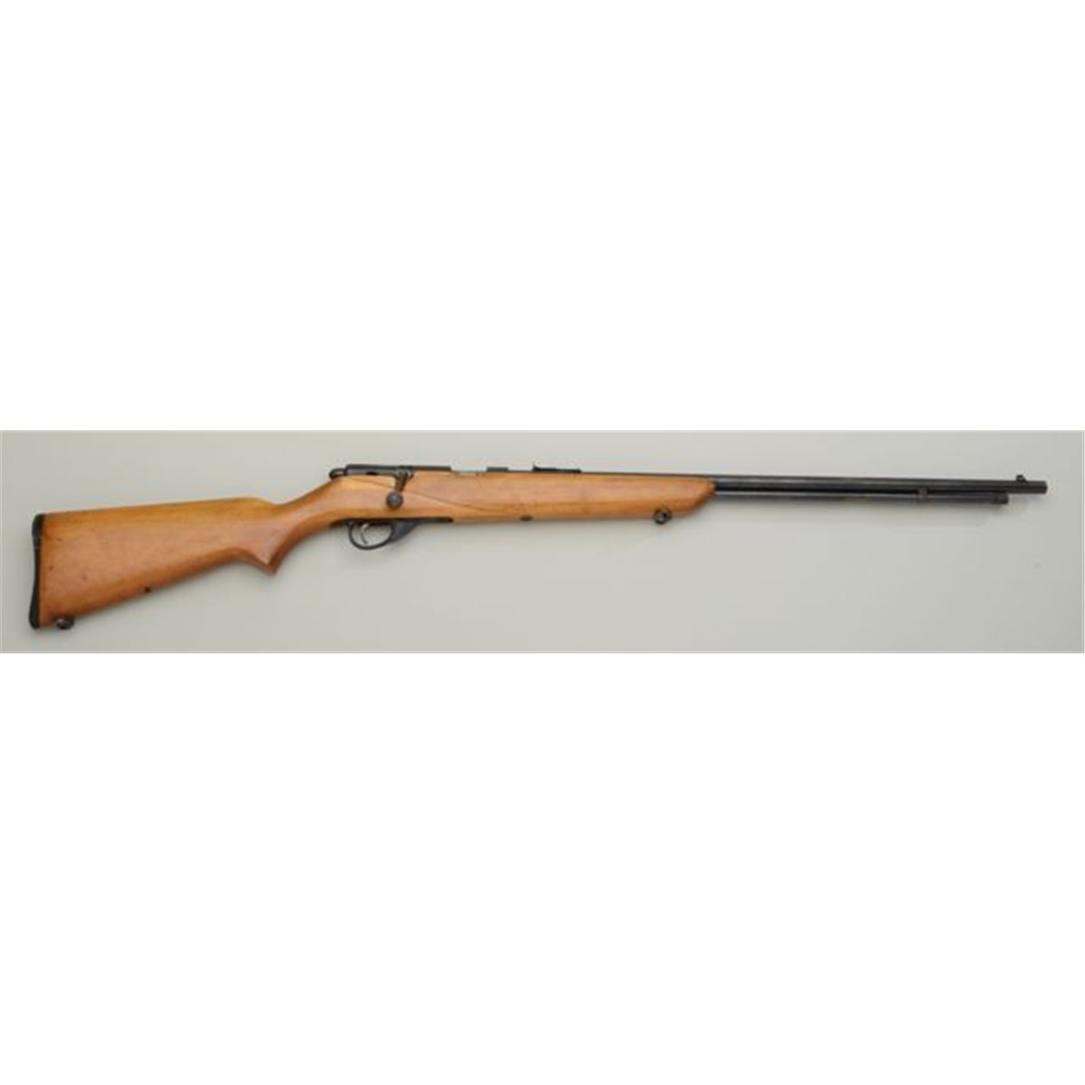 Ranger Model 103-13 bolt-action rifle, .22 short, long or long rifle cal., 24” round barrel, blue finish, wood stock, #NVSN. This gun is in overall fair to good condition showing scattered original blue, bore mayclean to good, good action, wood stock shows a repaired crack on the right side above the trigger. Est.: $50-$75.