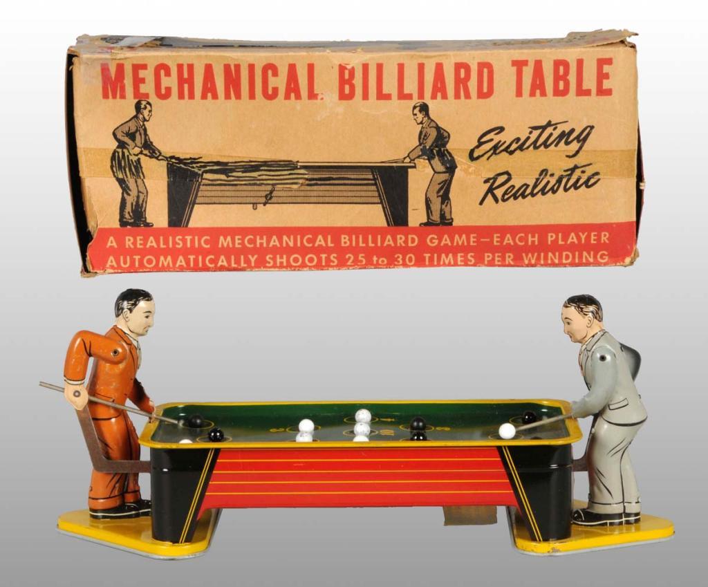 Description Working. Includes bag full of white and black steel balls. When wound, pool player's pool sticks go back and forth. Nice, bright, and shiny tin litho with very little wear. Includes original partial box with moderate creasing and tears and end flap copies. Condition Toy (Very Good) Box (Good). Size 15" L.
