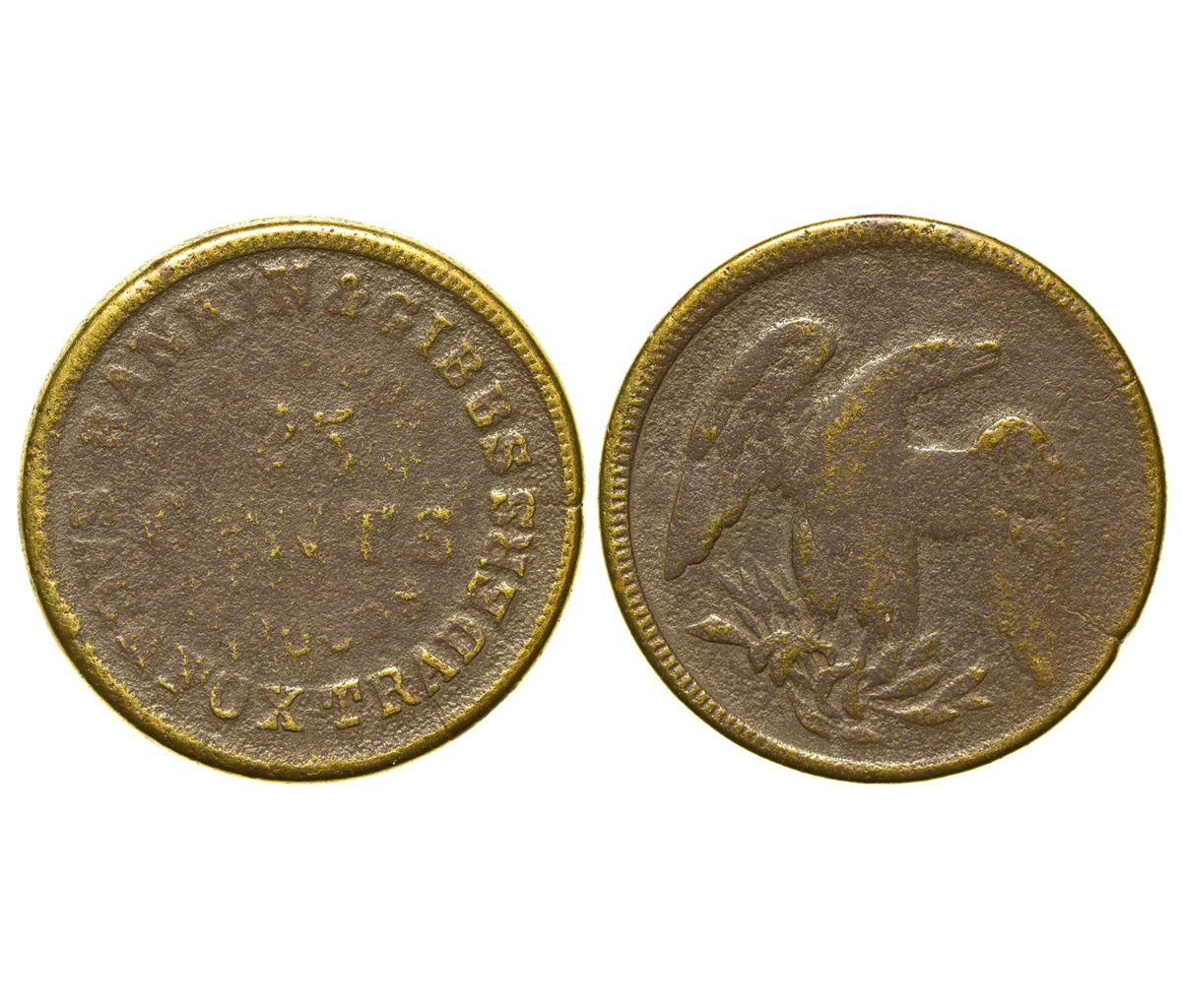 Rev. Rankin & Gibbs/Sac & Fox Traders. For 25c in goods. Obverse with eagle. The Sak and Fox are an Algonquin tribe that paired up after several wars which nearly killed the Sac tribe off. After pairing up, each of the respective tribes kept their own chiefs and tribal characteristics. The Sac tribe was typically seen as the more warlike tribe by European traders and explorers. The Fox tribe were named so from the fox band of the Meskwakie tribe who had the fox as their totem. Initially the Fox tribe suffered from their protection of the Sac tribe. The French enlisted other tribes to war with the Sac and Fox until their numbers decreased significantly within a few short years. This also caused the tribe to move down the Mississippi into southern Illinois from their original home in Saginaw Bay and the Detroit area [tripod.com/saukfox]. -57216
