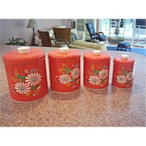 This is a red orange aster cannister set made by Ransburg. The cannisters stand 7", 6", 5", and 4". There is some minor paint wear as seen in the pictures. the scratching is minimal. The flower design is in good shape on all of them. The insides have wear but are still usable. The coffee canister has the worse of the wear on the inside and was repaired with a good job being done. These could certainly be used as well as displayed. I might suggest lining them with a bag or some contact paper to prevent further wear to the metal. This Ransburg pattern is very collectible and it's hard to find these cannisters in good shape and still usable. So take a good look because you might have to look a long time to find another set as good as this one.<BR>